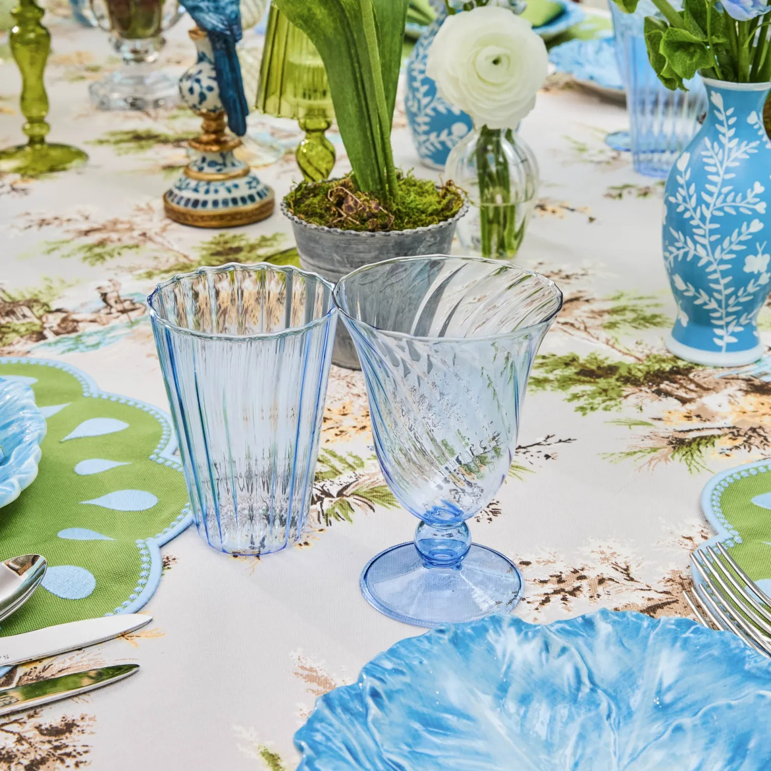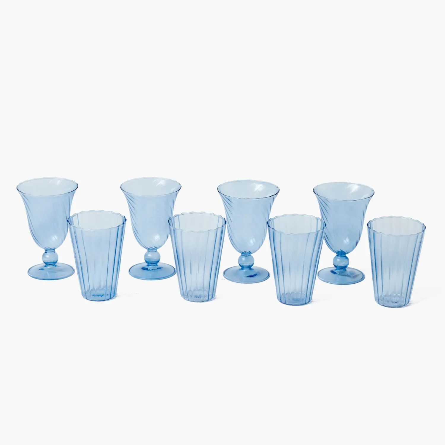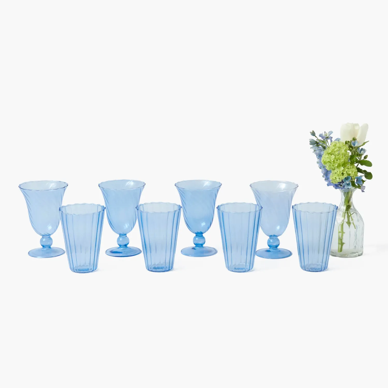 Our elegant Blue Fluted Glassware Set is a lovely and chic addition to your springtime tables. Designed for four, this glassware set features both water and wine glasses in pastel blue glass. Each piece features a delicate fluted design and will be a classic addition to your tablescape.