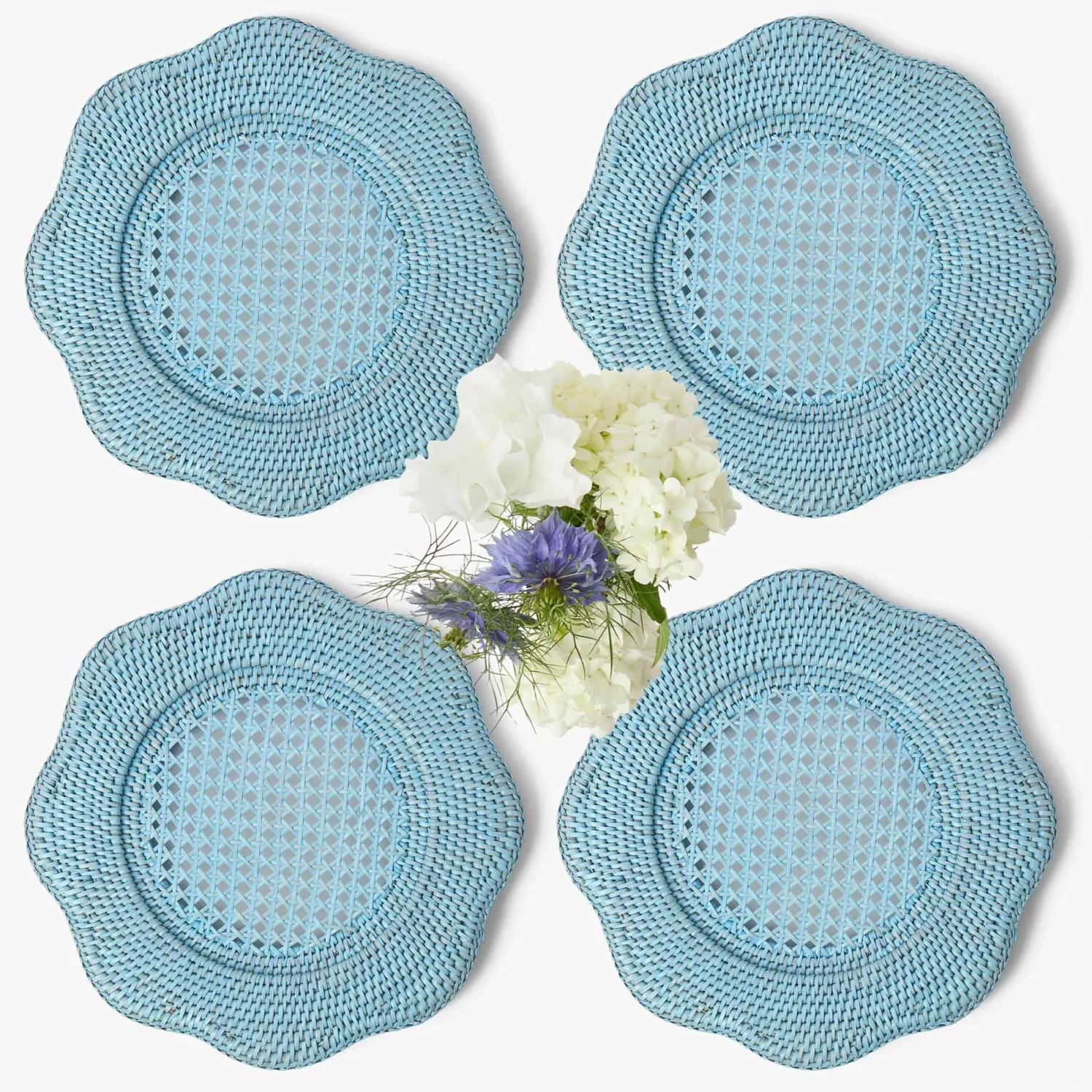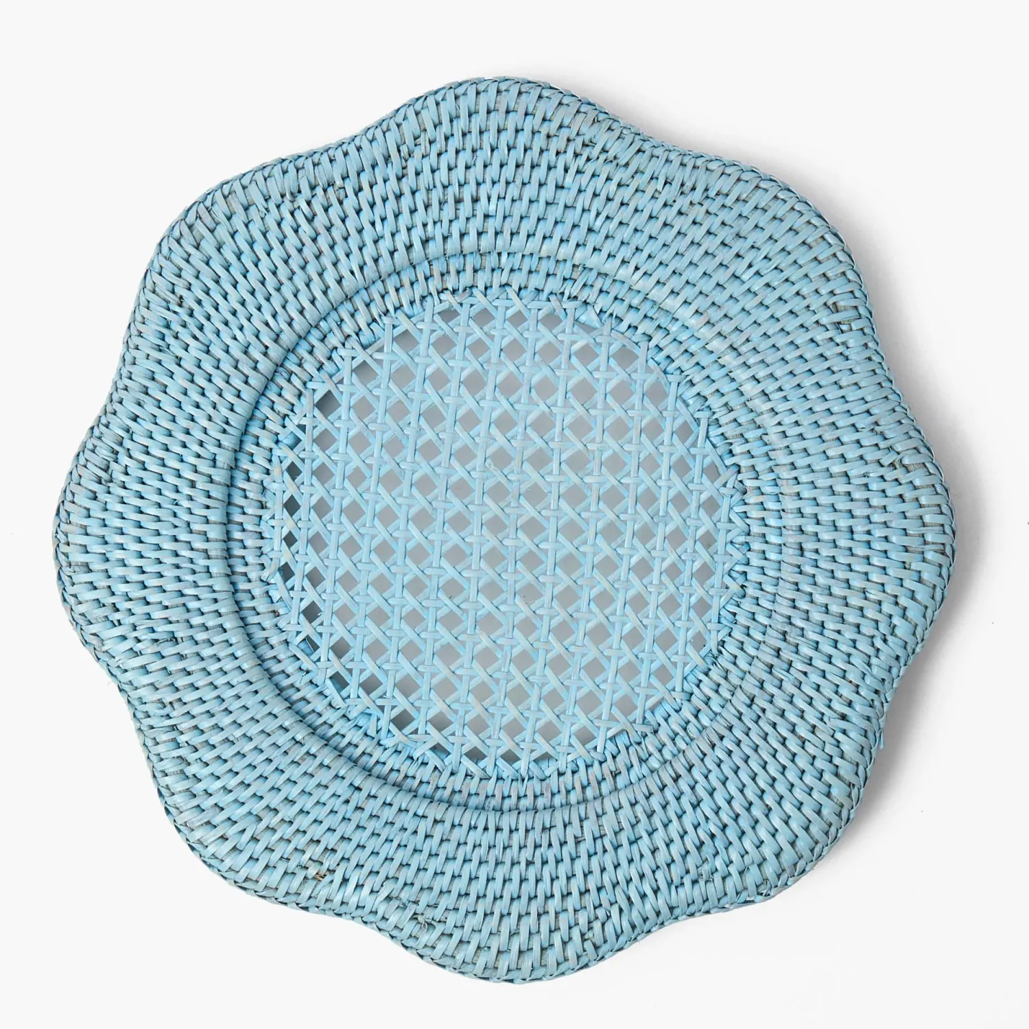 Elevate your indoor and outdoor dining with our Blue Scalloped Rattan Charger Plates. This four-person set is adorned in a soft blue and has been hand-woven by our skilled artisans. Pair yours with crisp linens for a beautiful layered look.