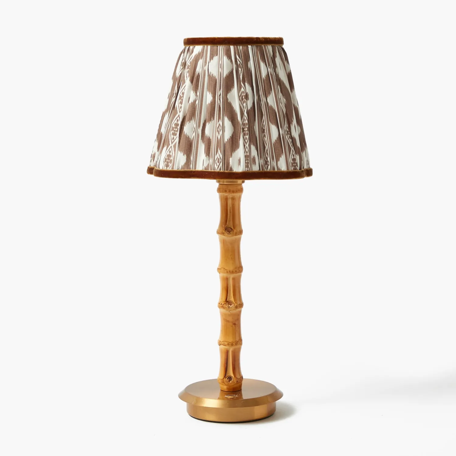 Elegant and chic, it features Serena Fresson’s Ikat Fabric in a warm brown with a matching chocolate velvet trim.