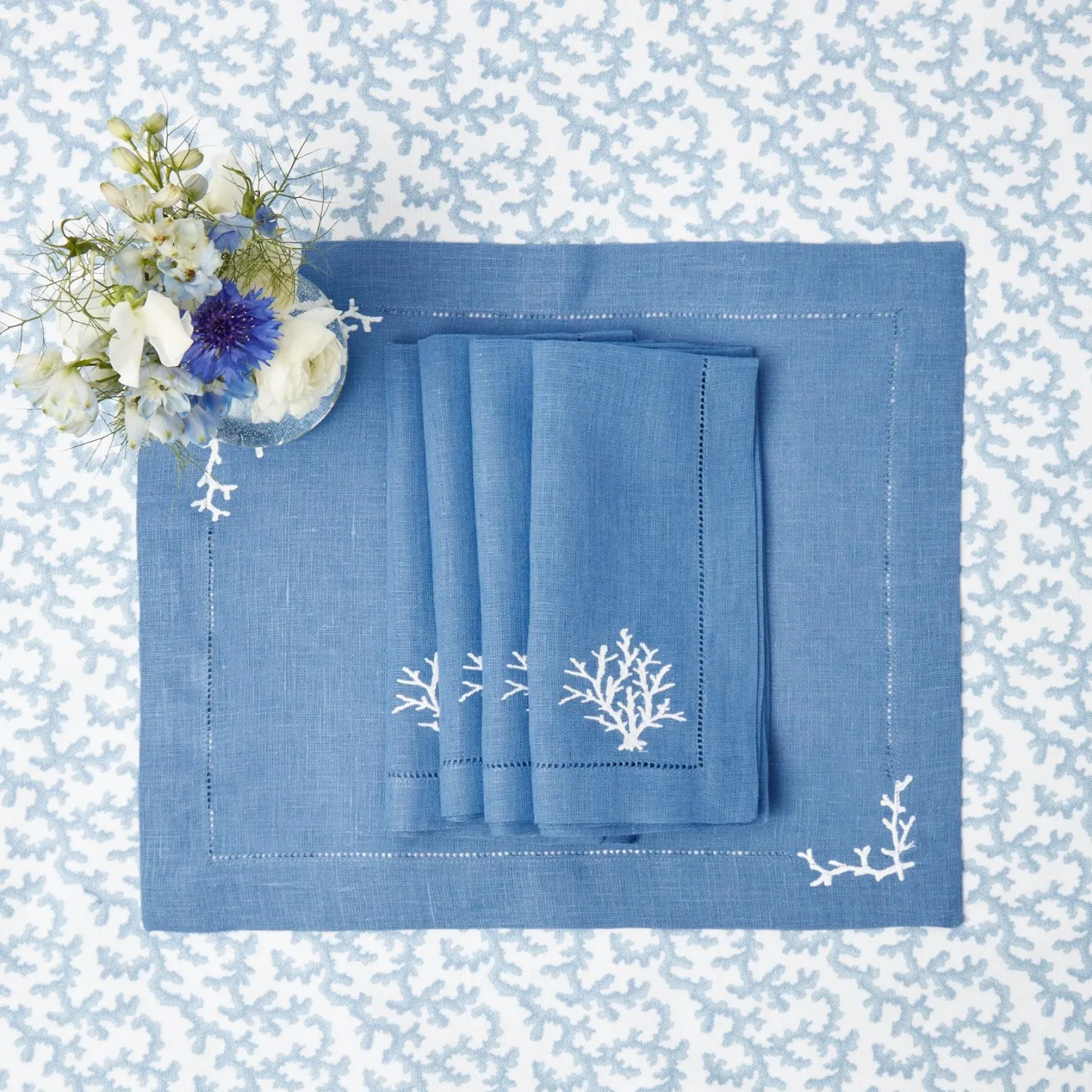 These delightful Napkins in crisp Blue Linen feature an embroidered coral detail in white.