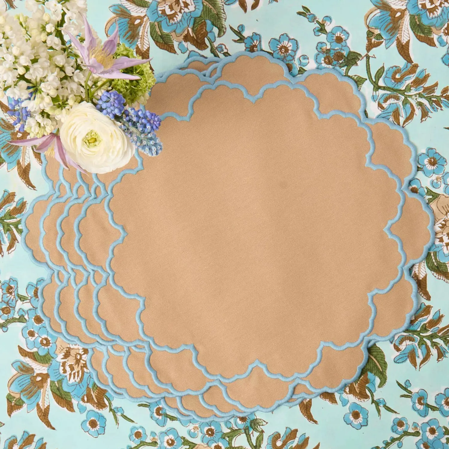 Dress your table in versatile linens like our Lily Sand & Blue Placemats. These four sandy pieces come cut in a scalloped circle and feature an azure trim. Pair with our matching napkins for an Spanish-inspired coastal look.
