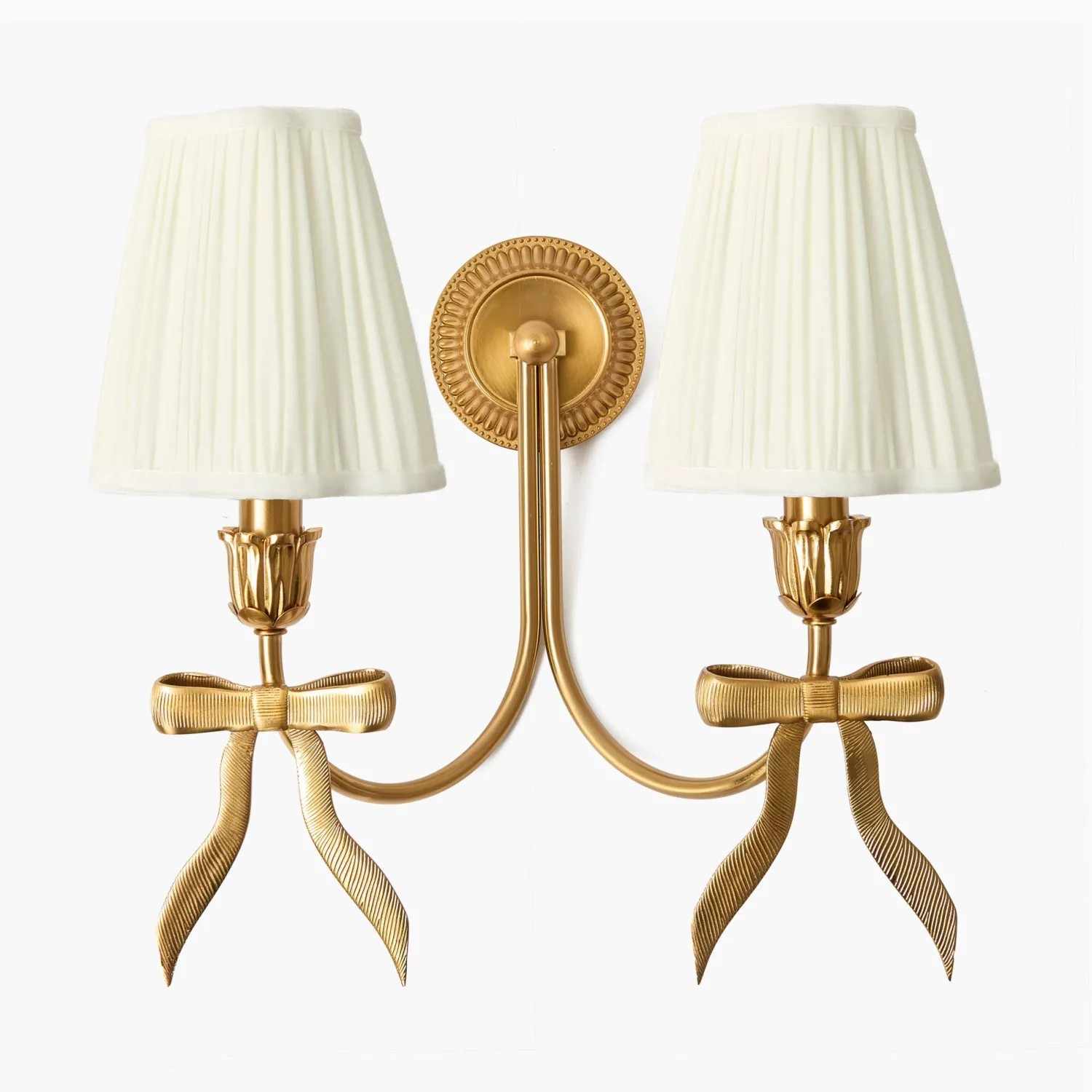 Illuminate your home with our stunning Marilyn Bow Rechargeable Double Wall Light. This golden piece features playful bow accents, two rechargeable bulbs and pleated cream lampshades. As a rechargeable piece, this wall light can be attached to your wall and dimmed by remote without needing hard wiring.