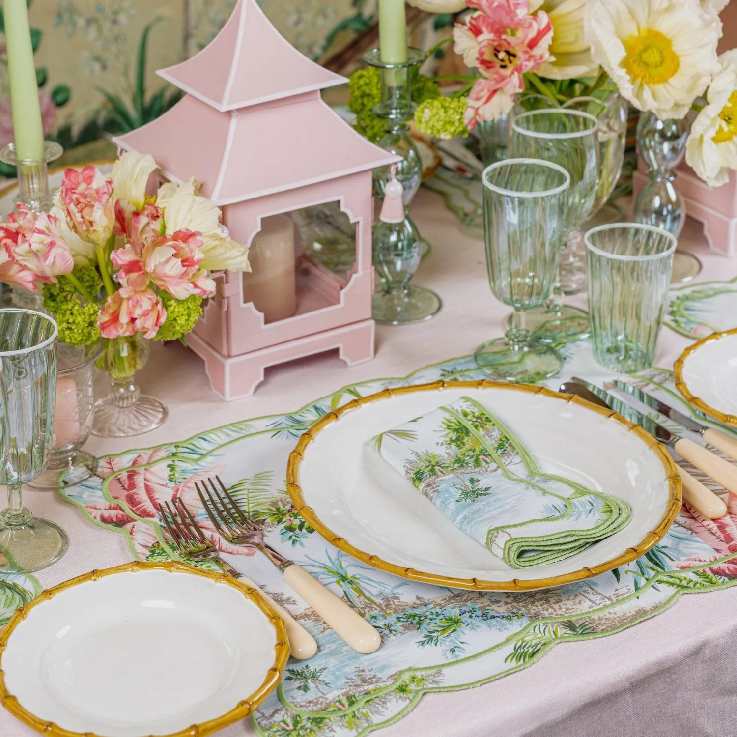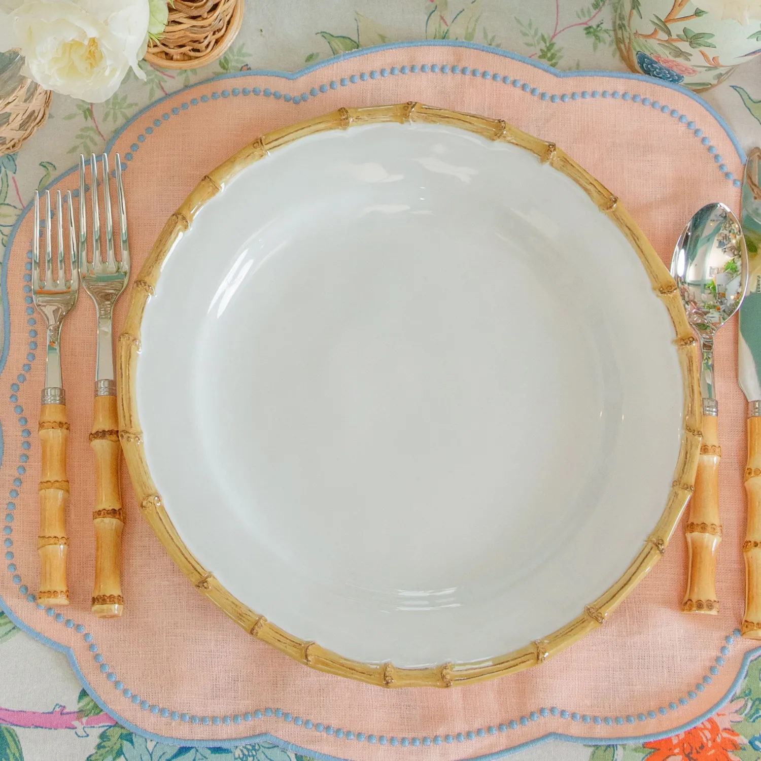 Accompanied by the Nancy Starter Plate, it also pairs beautifully with our Rattan Cutlery and our Blue with Red Scallop Linens.