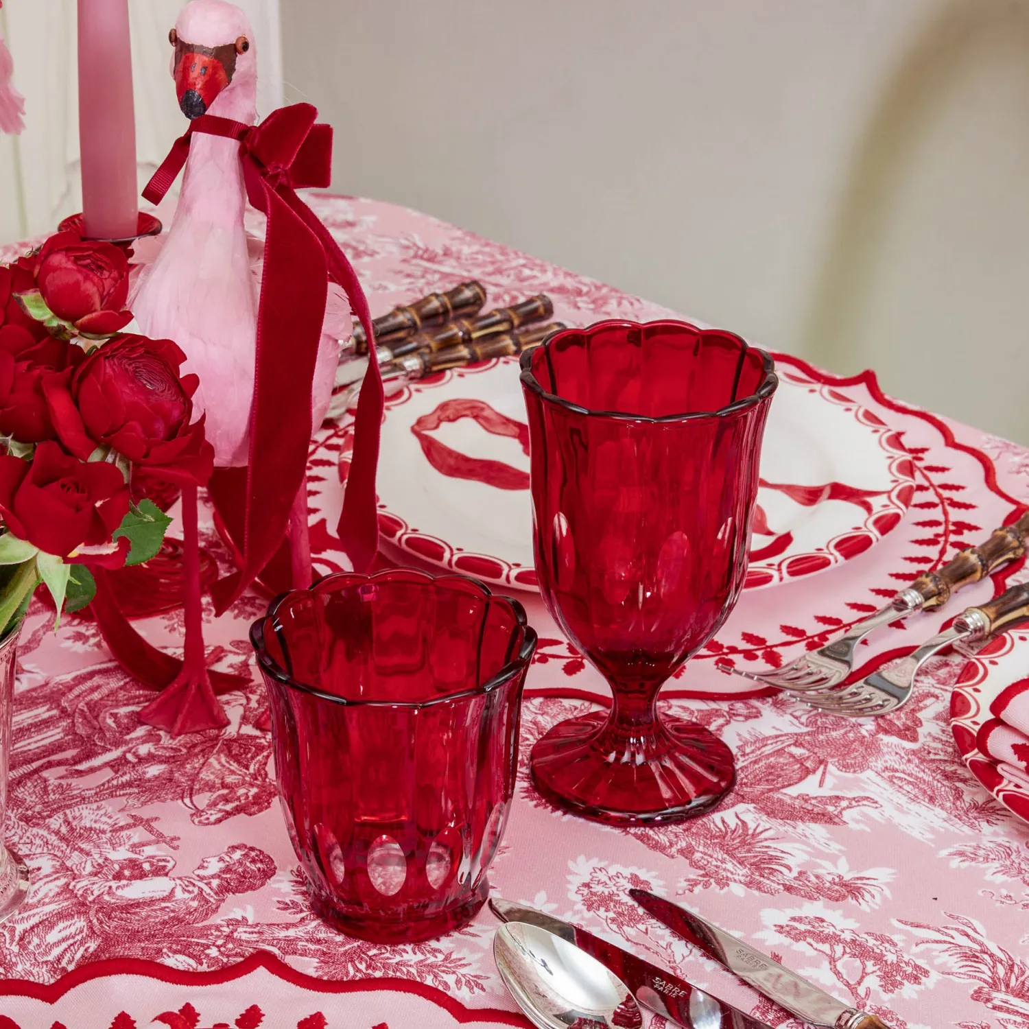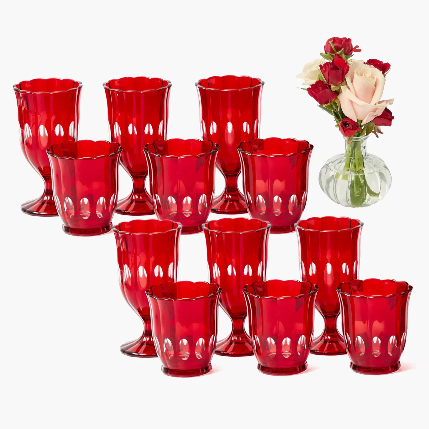 Our Red Scalloped Glassware set features 12 stunning glasses, specifically designed to uplift your festive feasts for six. Included are elegant wine goblets and water glasses, both with delicate scalloped edges.