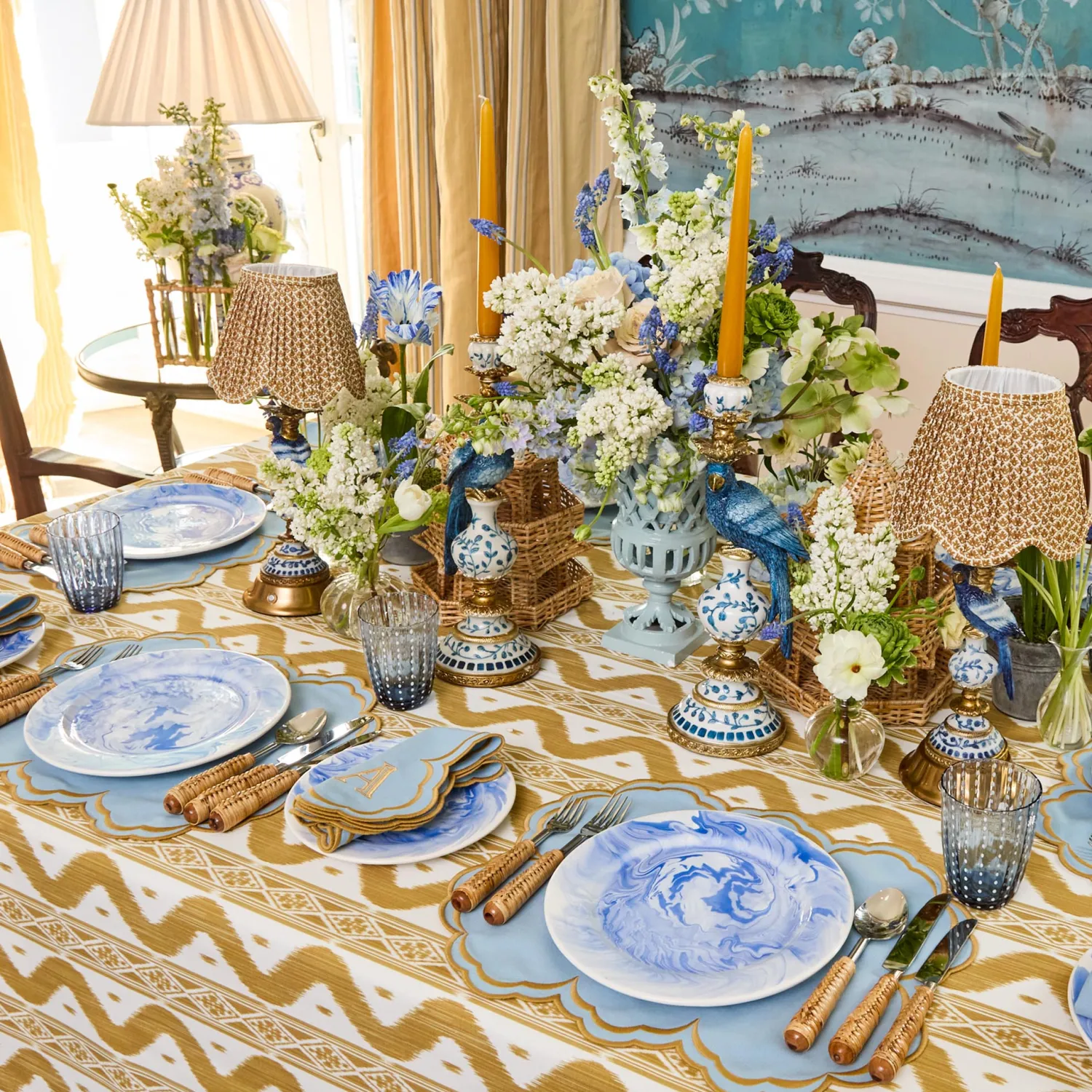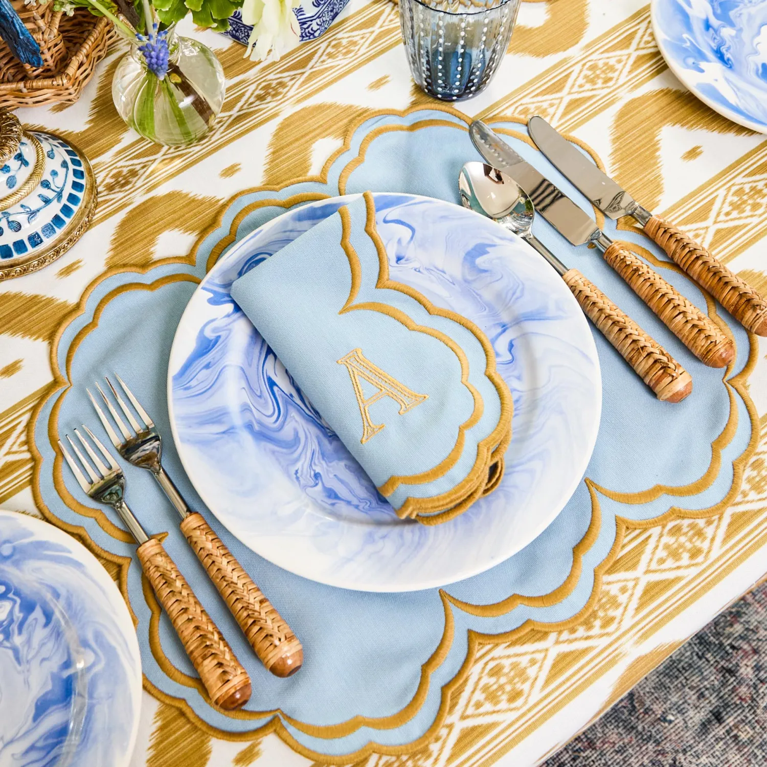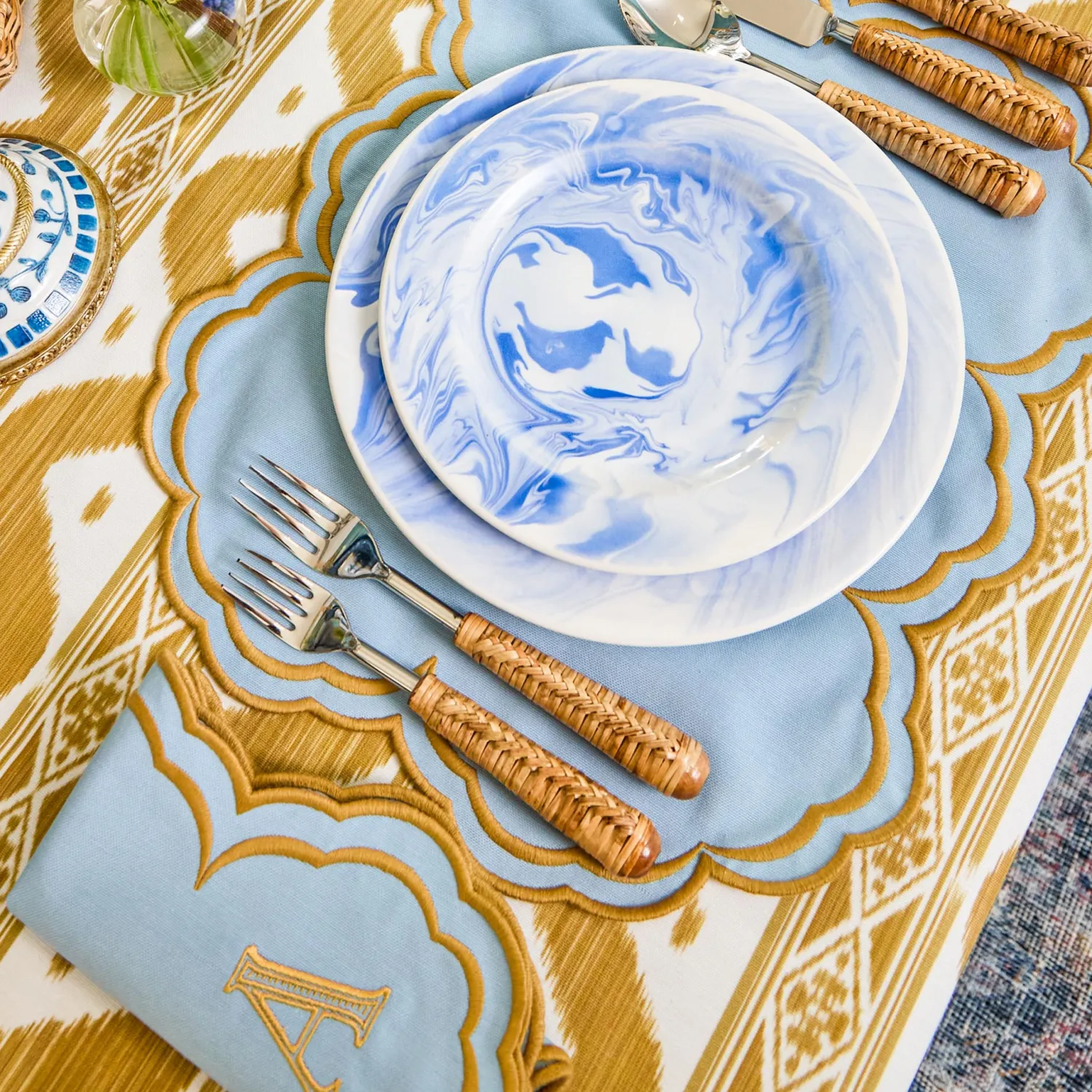 Our Serena Blue & caramel Placemats are the perfect foundation for your delicious dishes. Coming in a set of four, these light blue linens feature an intricate caramel-toned trim that will pair well with our napkins.