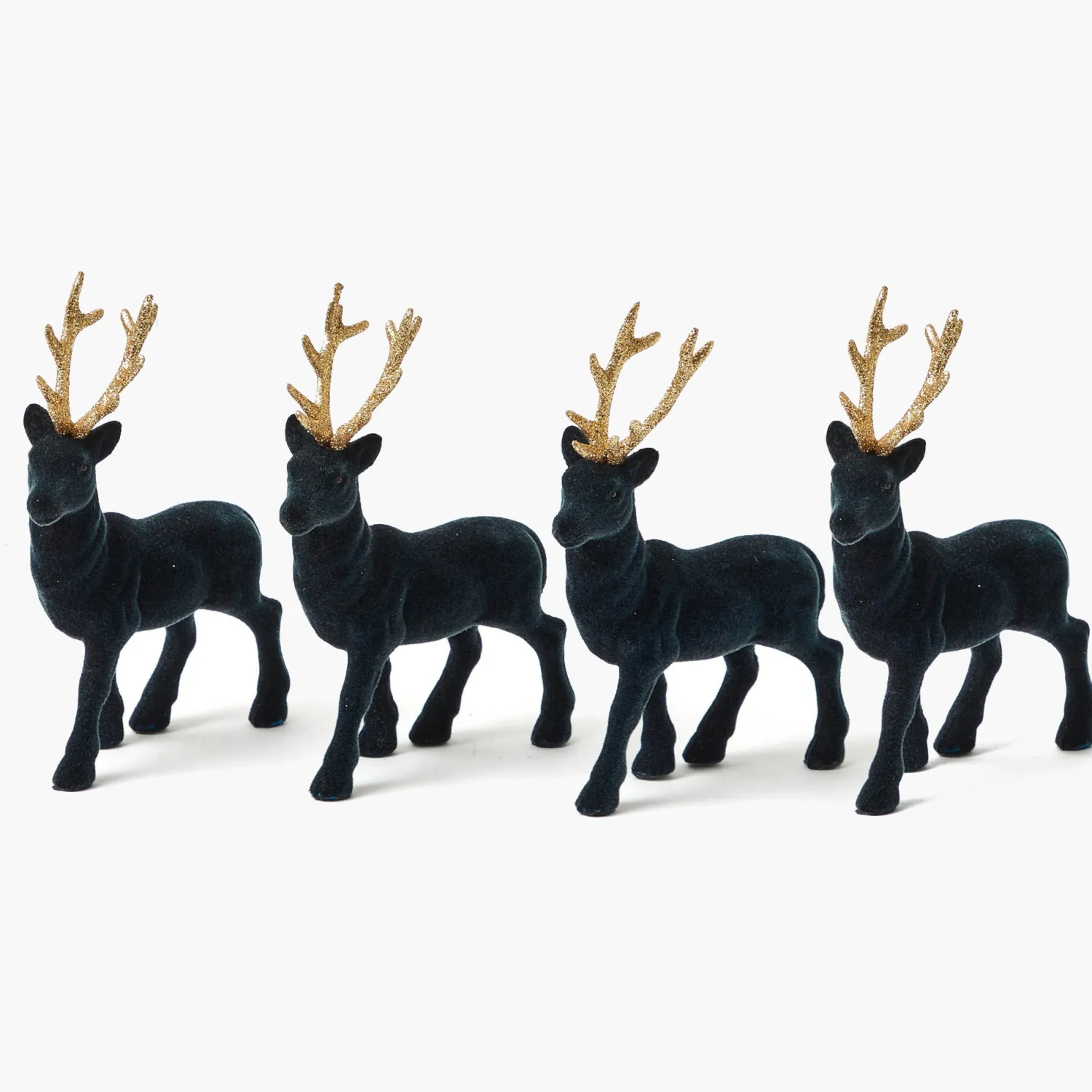 Create a festive scene with your very own Dasher, Prancer, Vixen, and Comet. Our set of four Small Flocked Navy Reindeer has a soft, velvety finish and are accented by golden antlers, perfect for adding character to your holiday table.