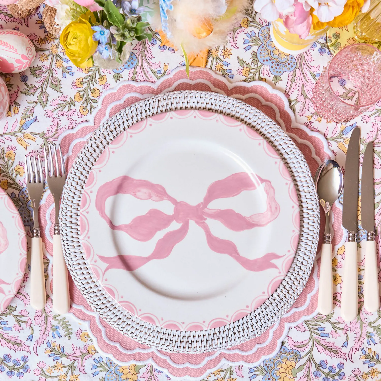 Frame your favourite plates with our Allegra Pink Placemats. These blush-toned linens come as a set of four and are cut in an intricate round design. Complete with a white wtin-tipped border, these placemats are sure to bring cheer to your table settings.
