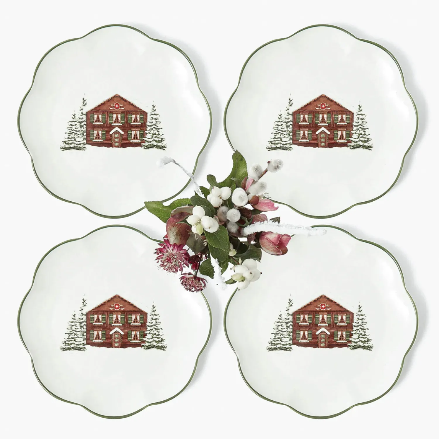Serve your seasonal starters in style with our Alpine Chalet Starter Plates. These four plates will make a wonderful addition to your holiday table, with their green scalloped trim and stunning chalet design on the centre.