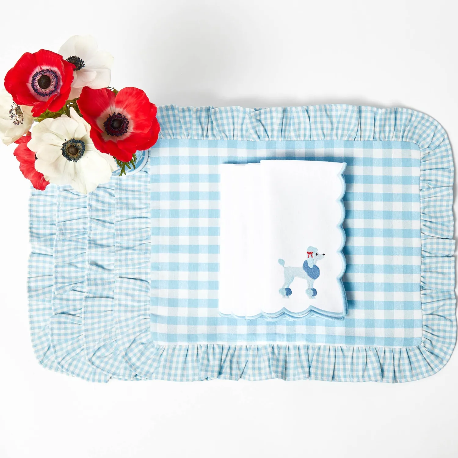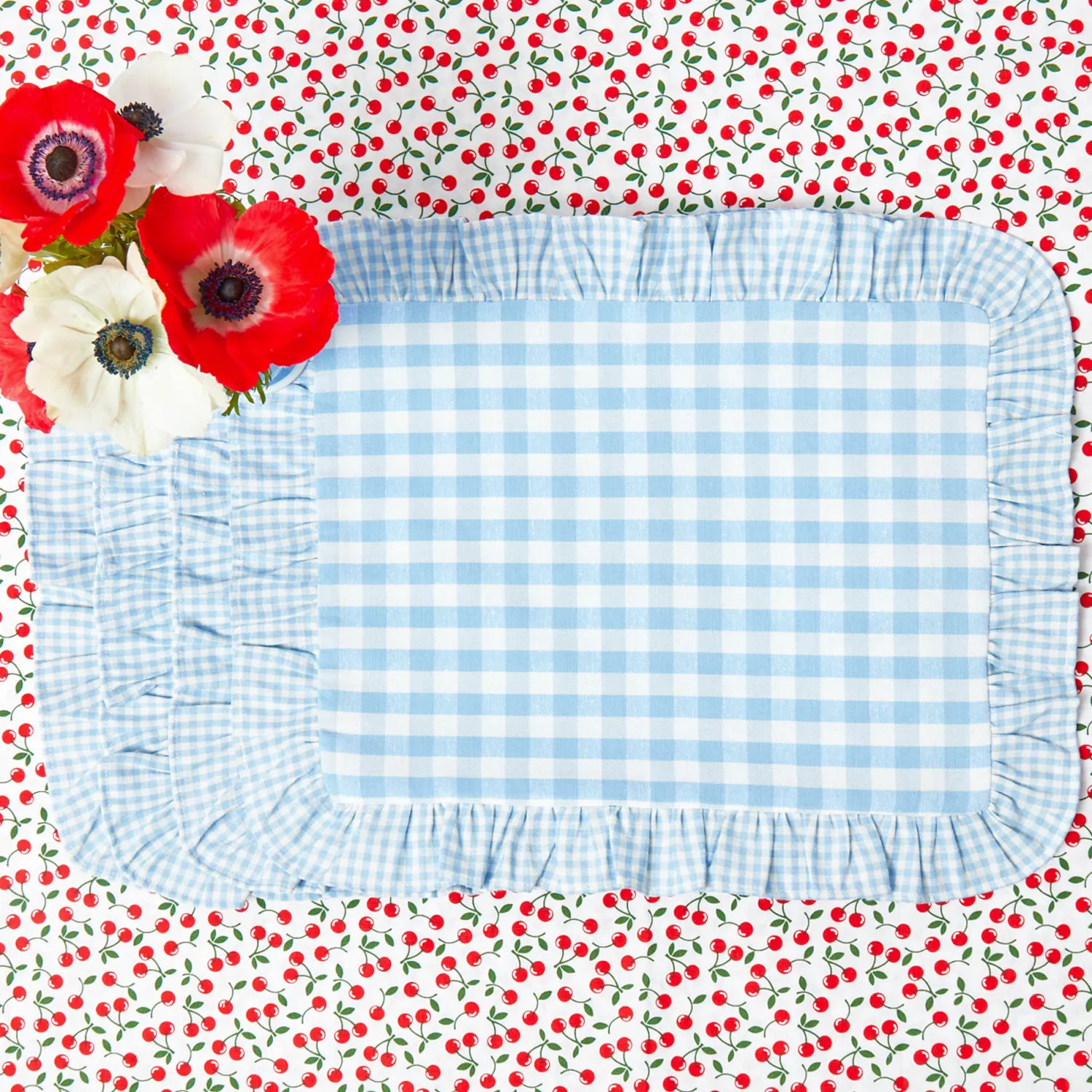 Our delightful Blue Gingham Ruffle Placemats are a contemporary take on the classic style. With the micro print on the ruffled trims and pastel colourway, these HVN X Mrs. Alice placemats are versatile pieces you can style throughout the year.