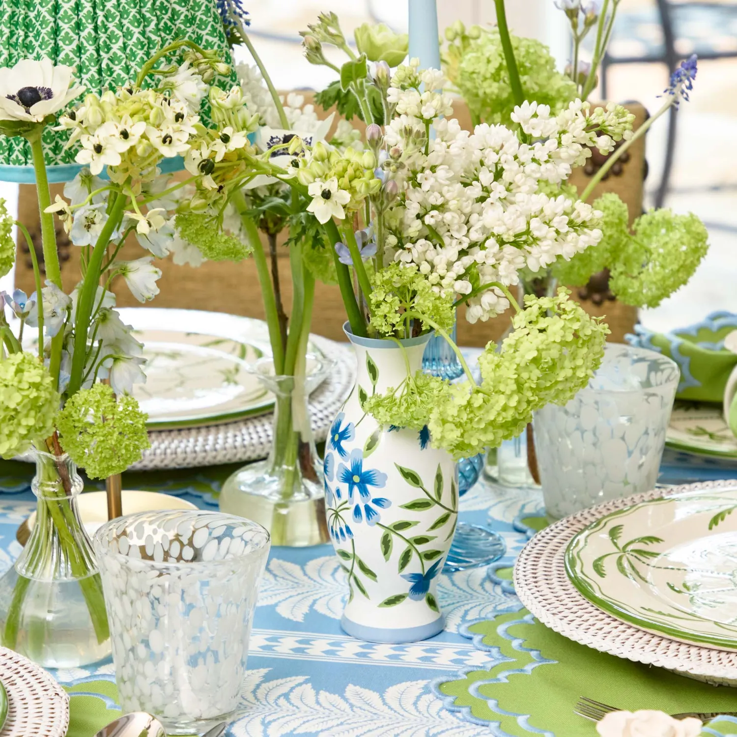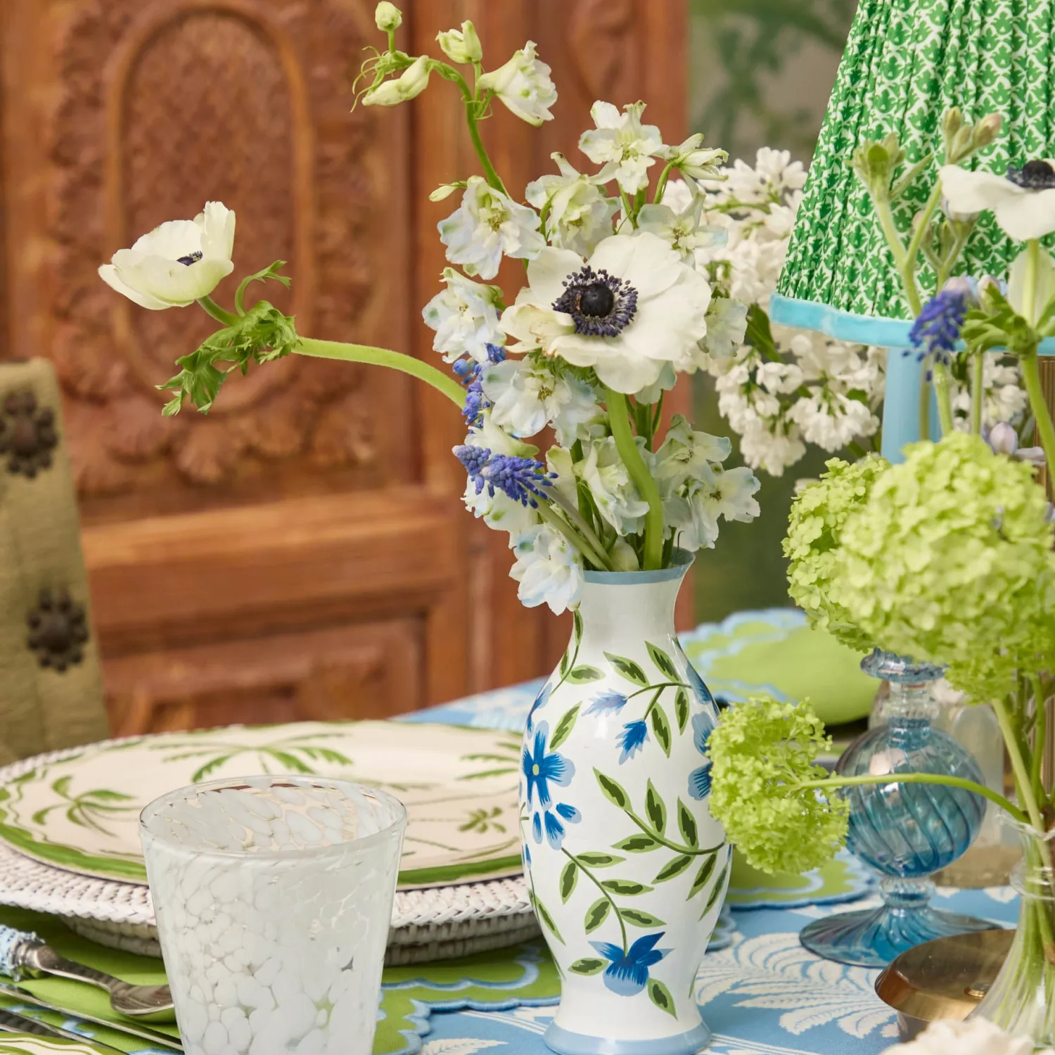 Our Blue & Green Hand Painted Tole Bud Vases come in a set of three, with each having a flourishing bouquet of dried flowers. The floral design painted on the vases features a mix of green and blue tones, perfectly complemented by the dried flowers.