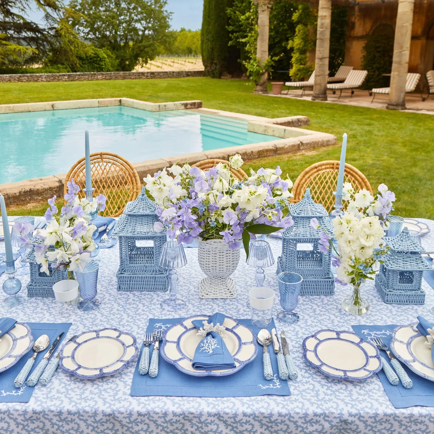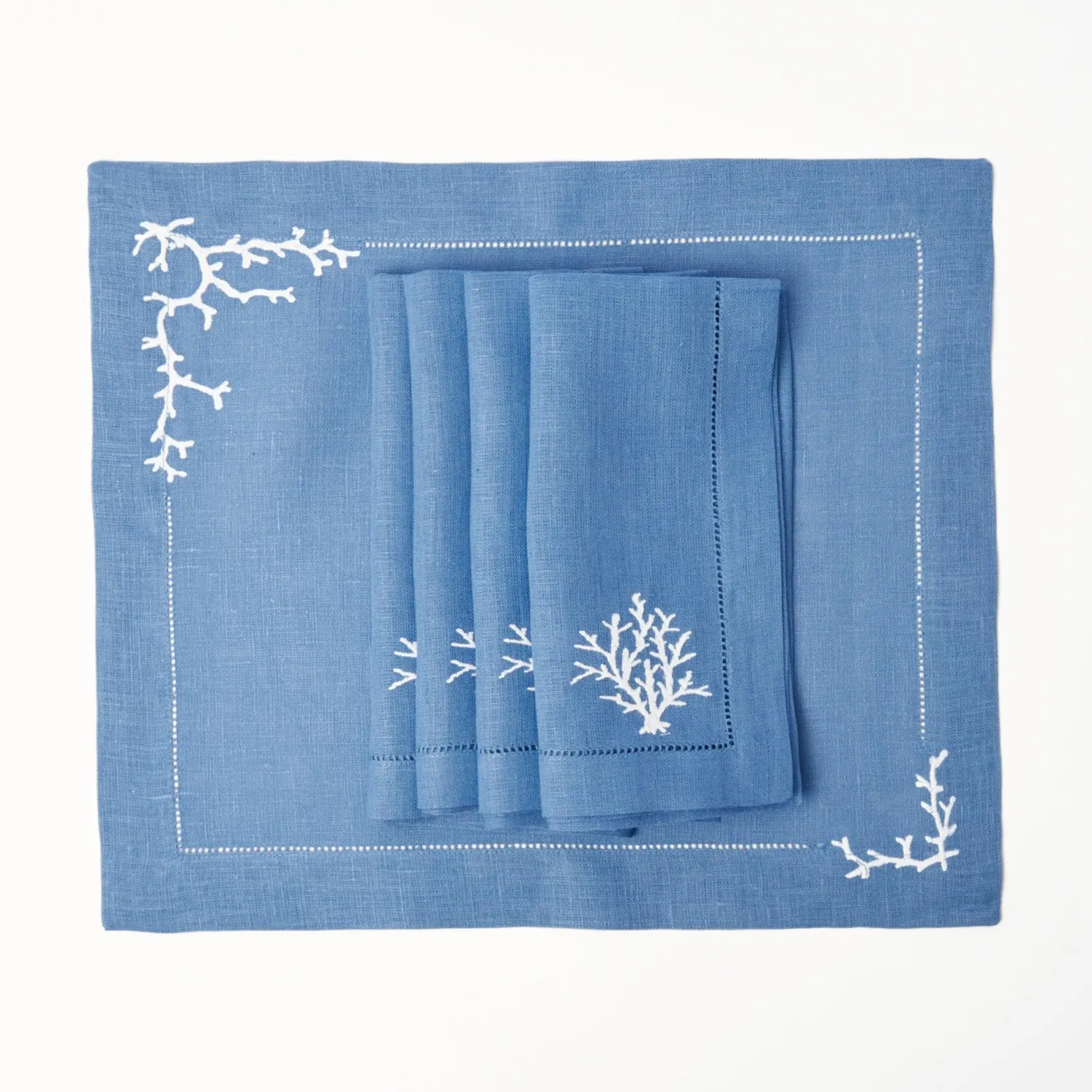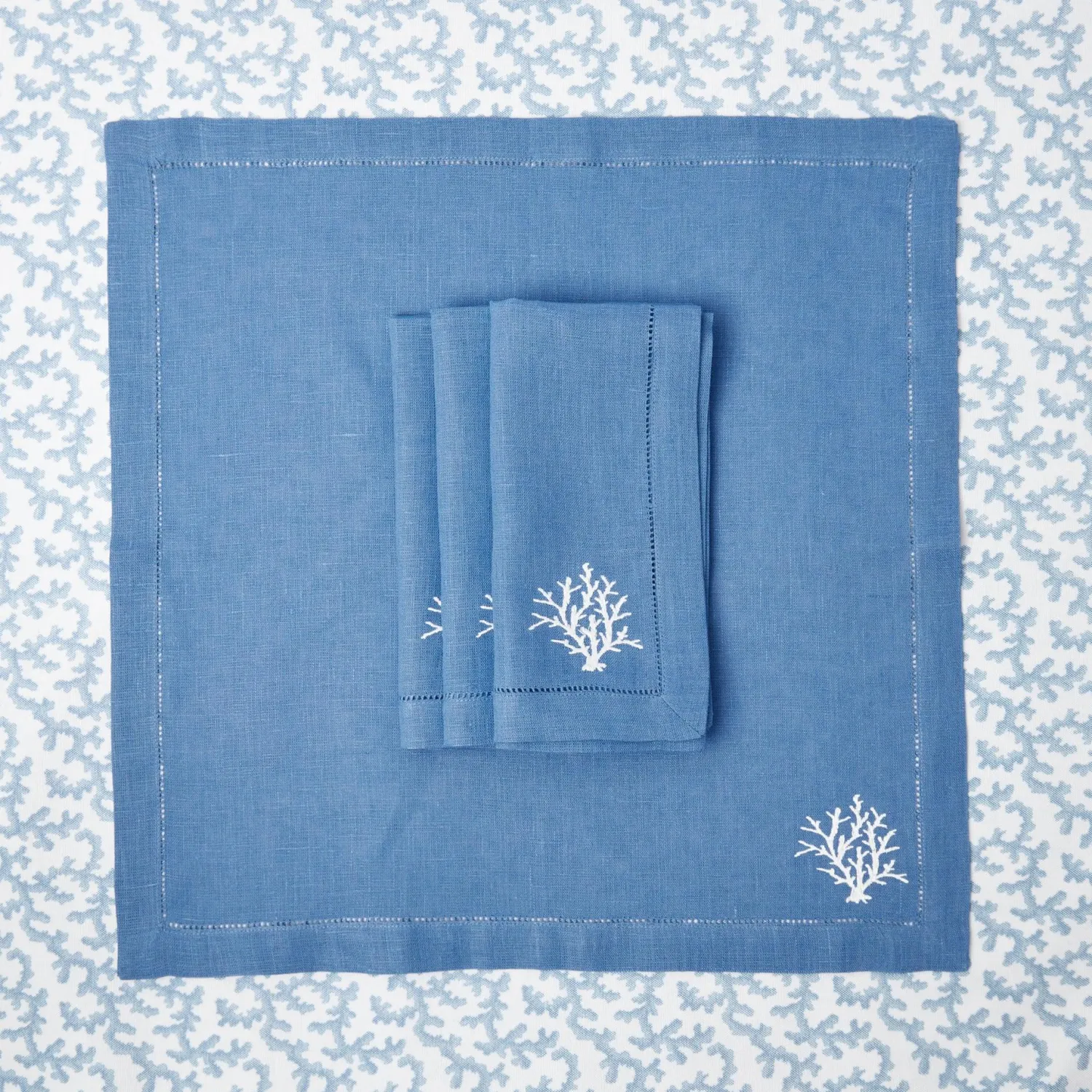 These delightful Napkins in crisp Blue Linen feature an embroidered coral detail in white.