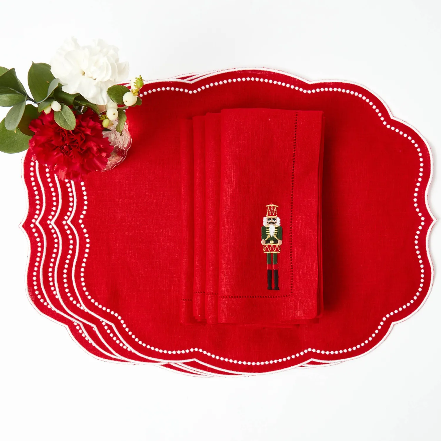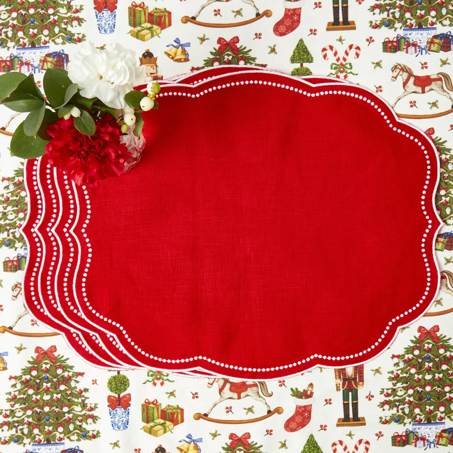 Our Eloise Red Placemats are quintessential Christmas linens that will elevate your festive table settings. Coming in a set of four, these vibrant red pieces have been signed off with a simple white embroidered trim.