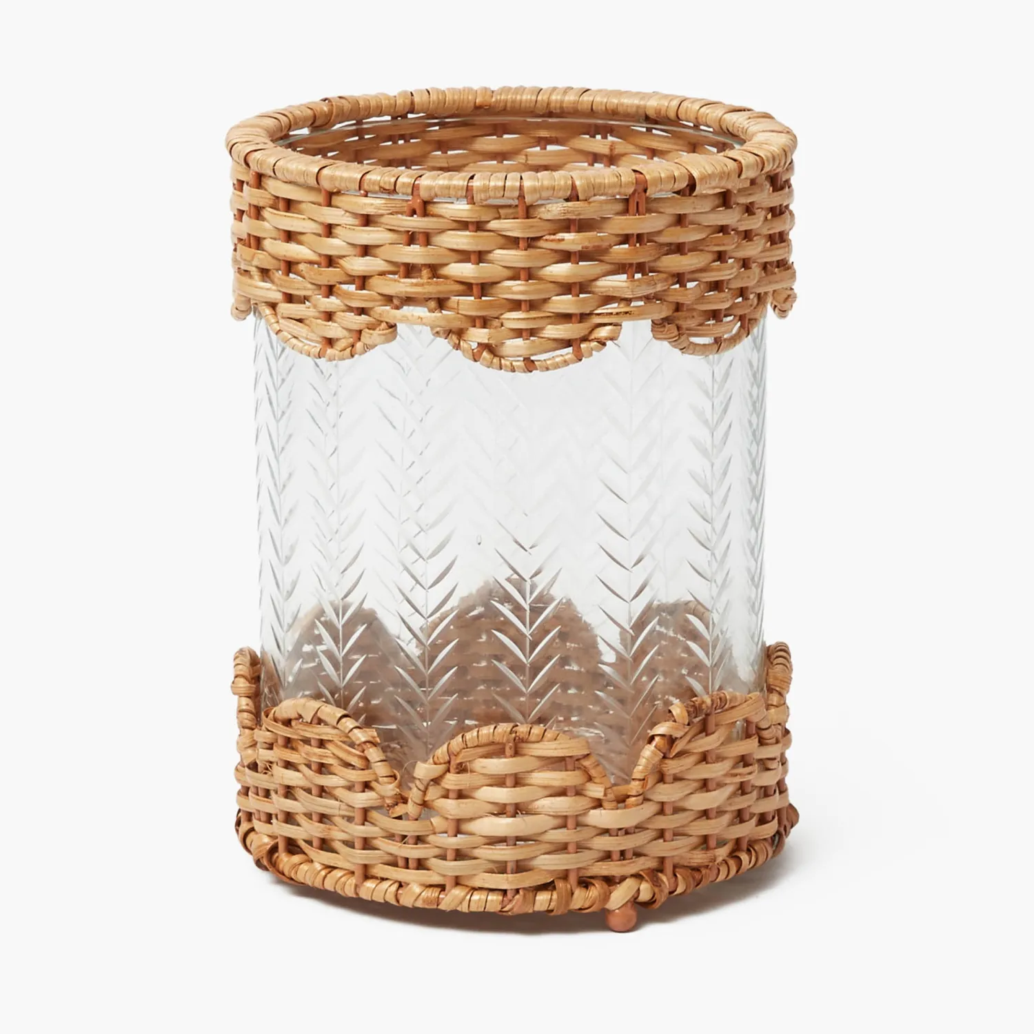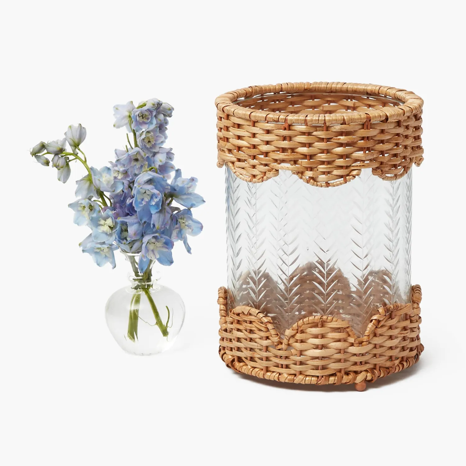 Host intimate dinner parties lit by candlelight with our Helena Rattan Hurricane Lantern. This handwoven piece has been designed to fit a pillar candle and features two scalloped rattan trims, perfect for entertaining both indoors and out.