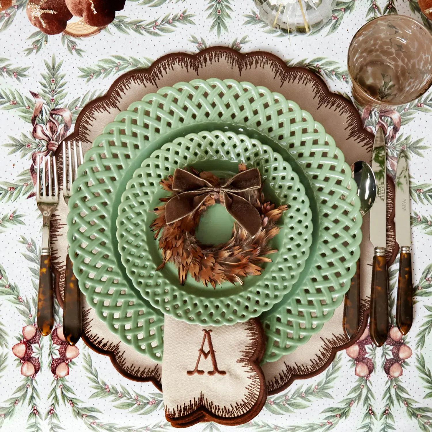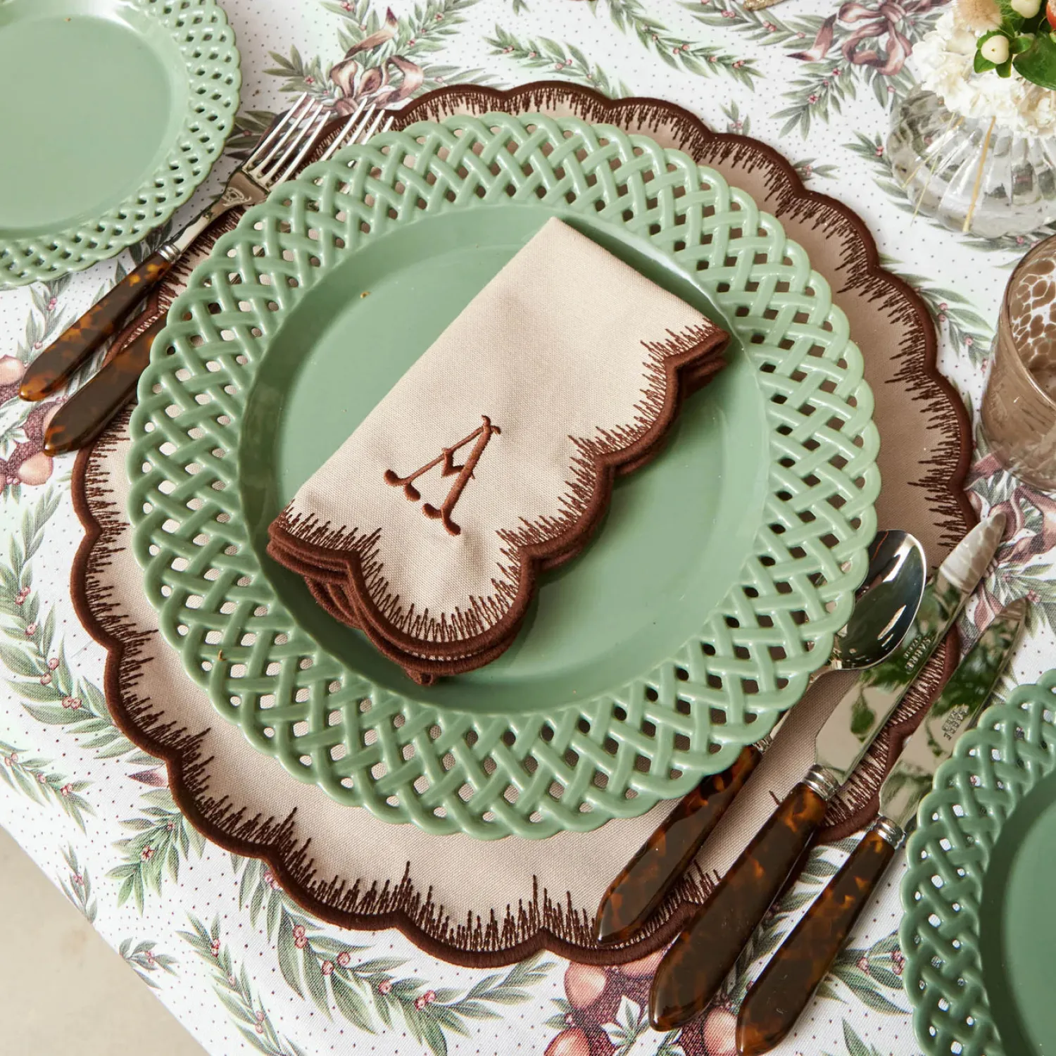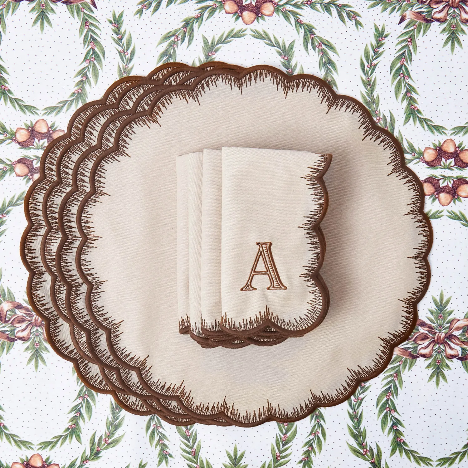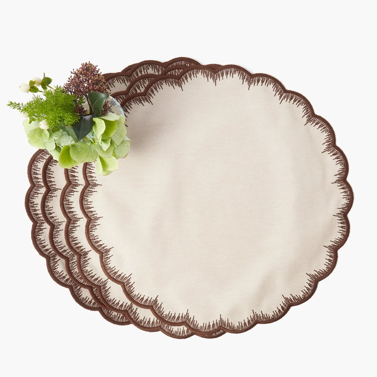Frame your delicious feasts with our versatile Isabella Taupe & Chocolate Placemats. These round placemats instantly ooze sophistication with their scalloped trim and chocolate embroidery.
