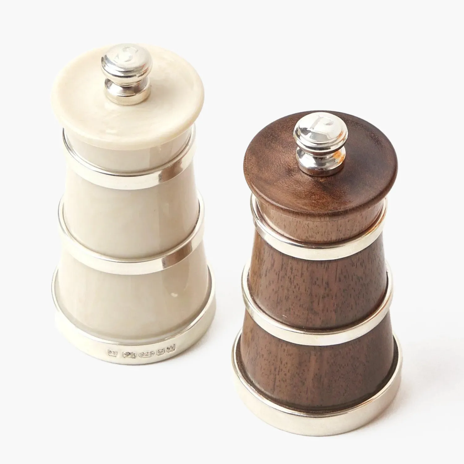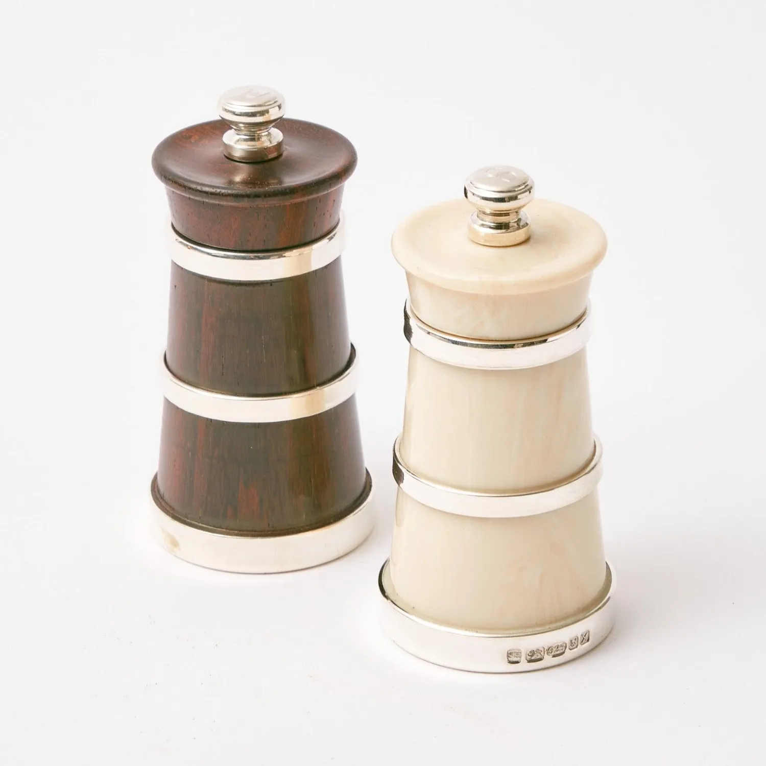 This set of magnificent Ivorine and Rosewood Sterling Silver salt and pepper grinders come in a classic English milk chu…