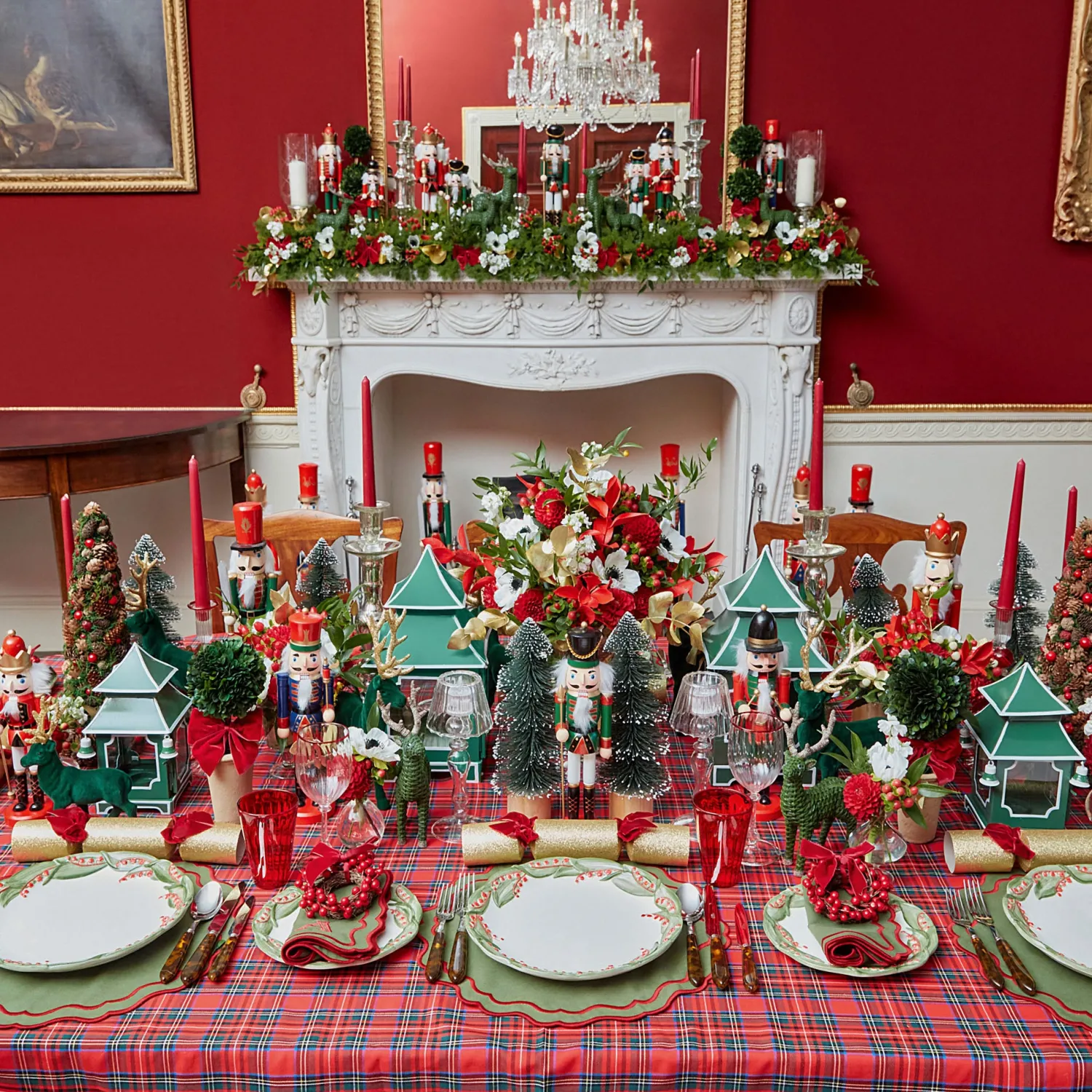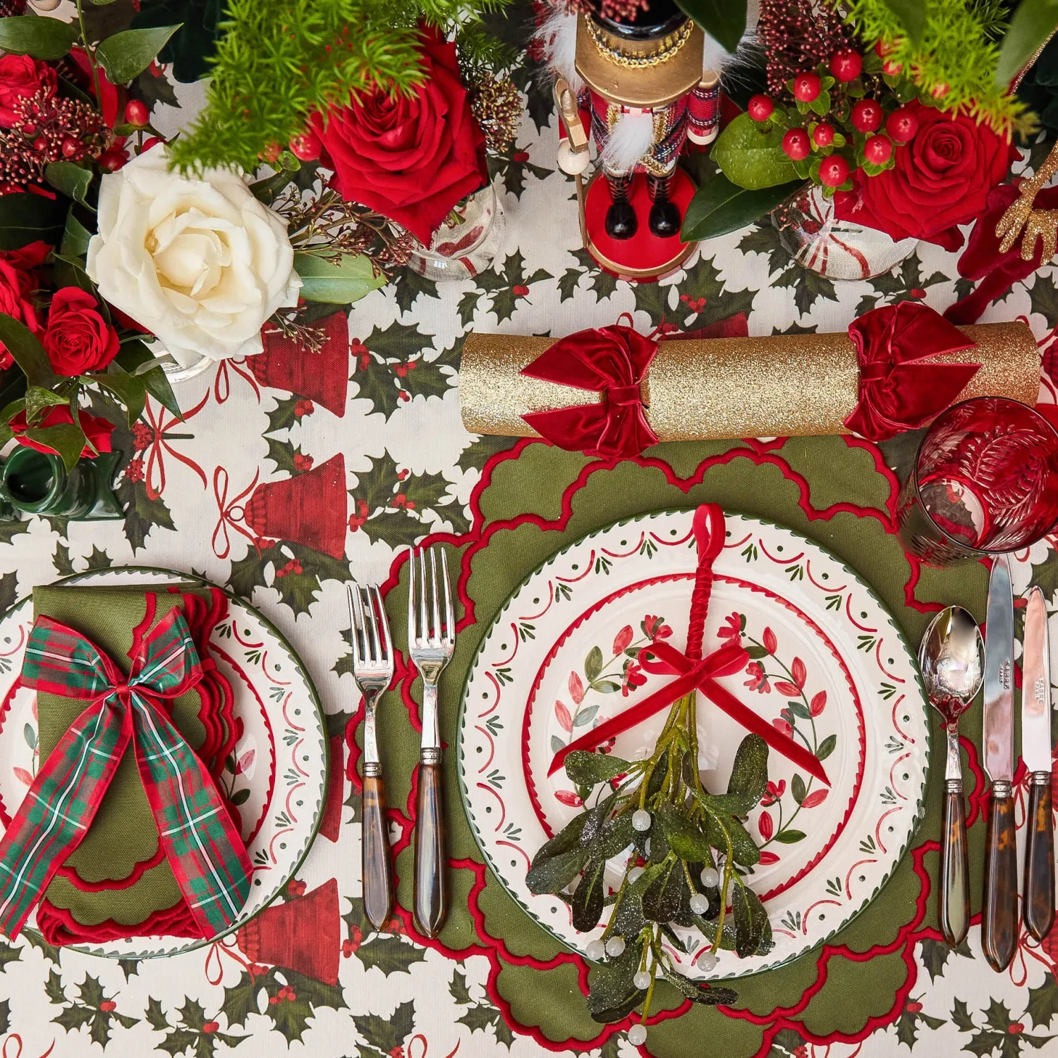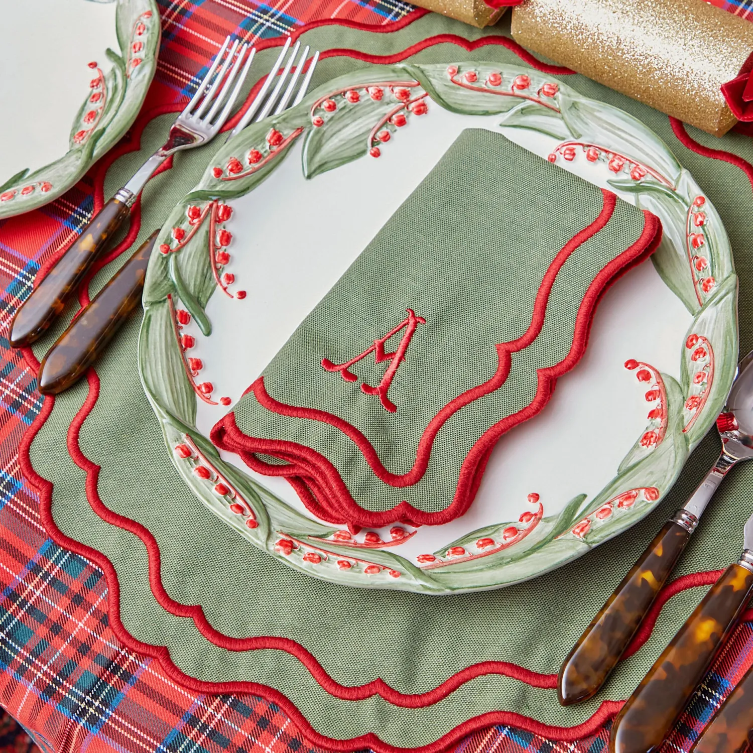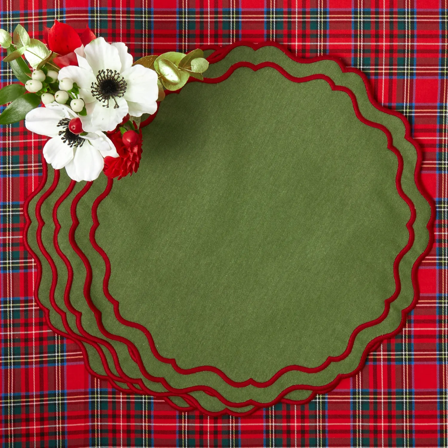 Our traditional round Katherine Green & Red Placemats have a double embroidered edge in an elegant scalloped style.