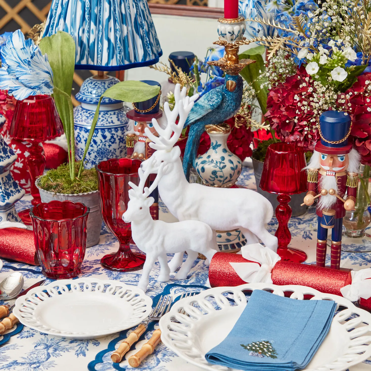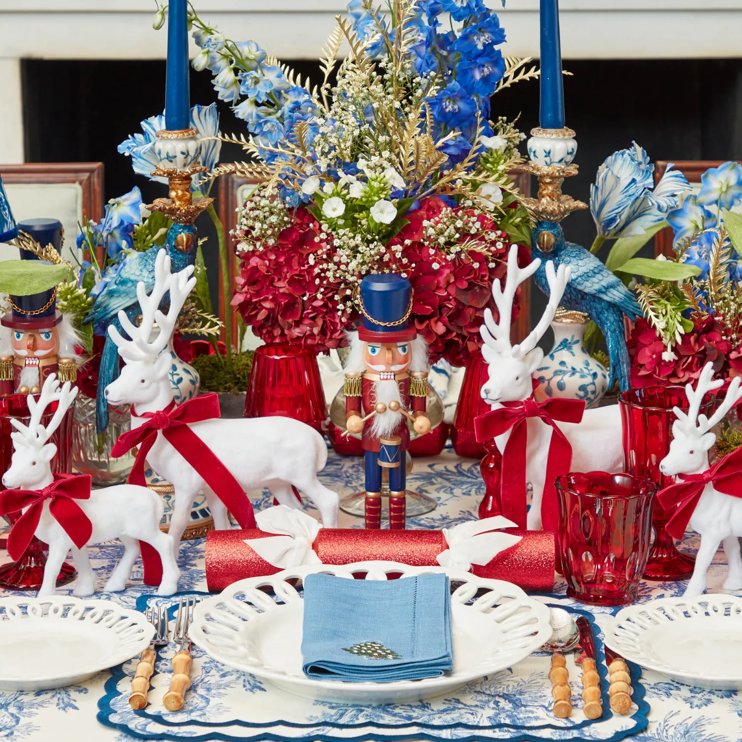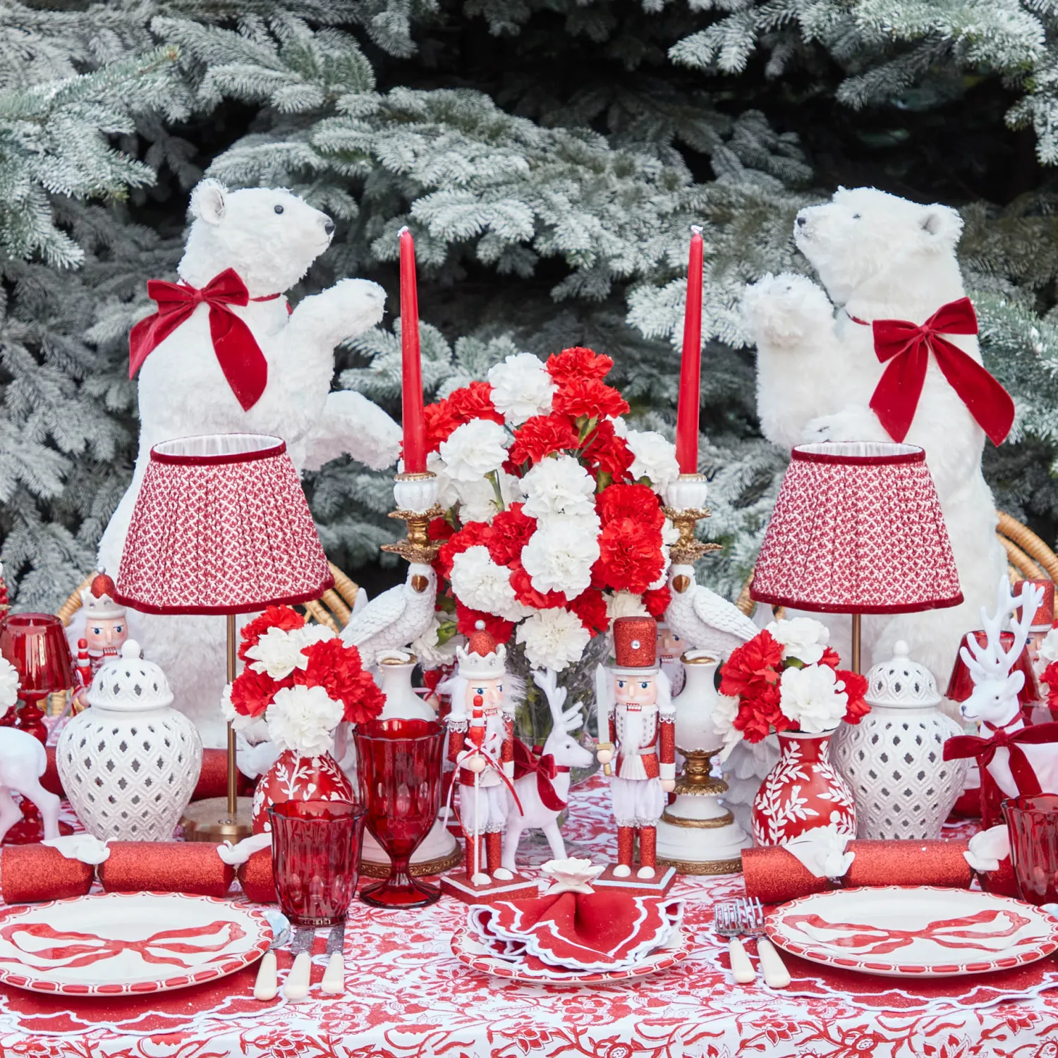Transform your holiday table into something truly enchanting with our Large White Flocked Reindeer with Velvet Bows. Com…