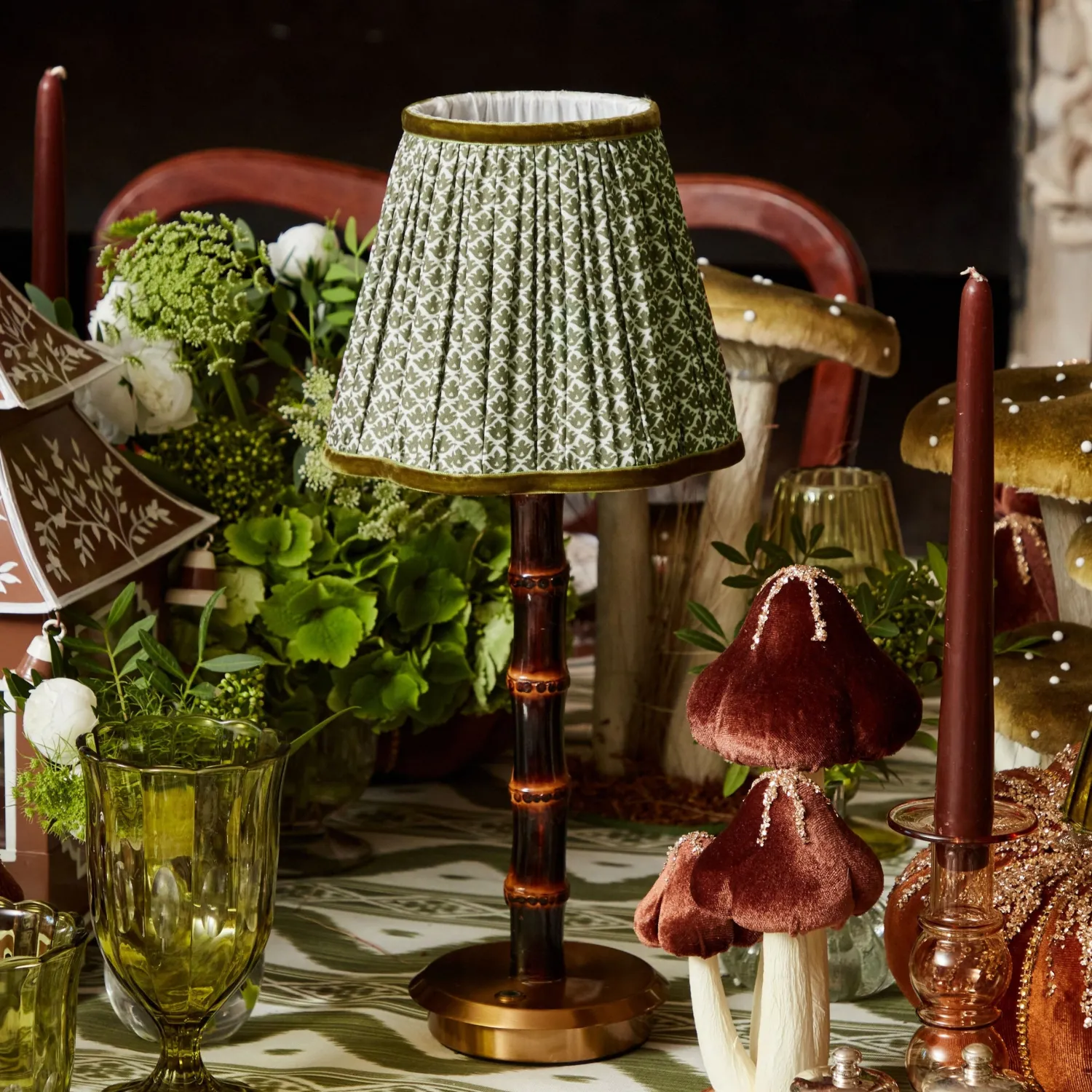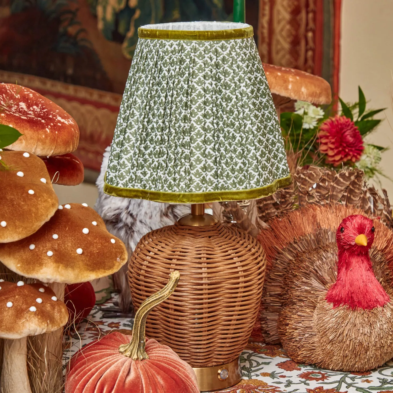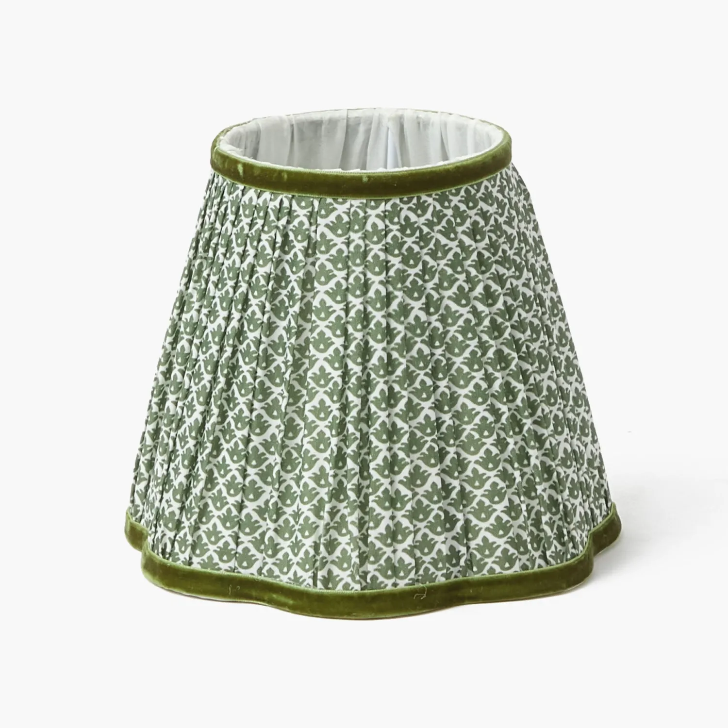 Our stylish Olive Green Lotus Flower Scalloped Lampshade adds a sophisticated touch to your home. Designed in Serena Fresson’s Lotus Flower Fabric, this elegant piece comes in a fabulous olive green with a matching olive velvet trim.