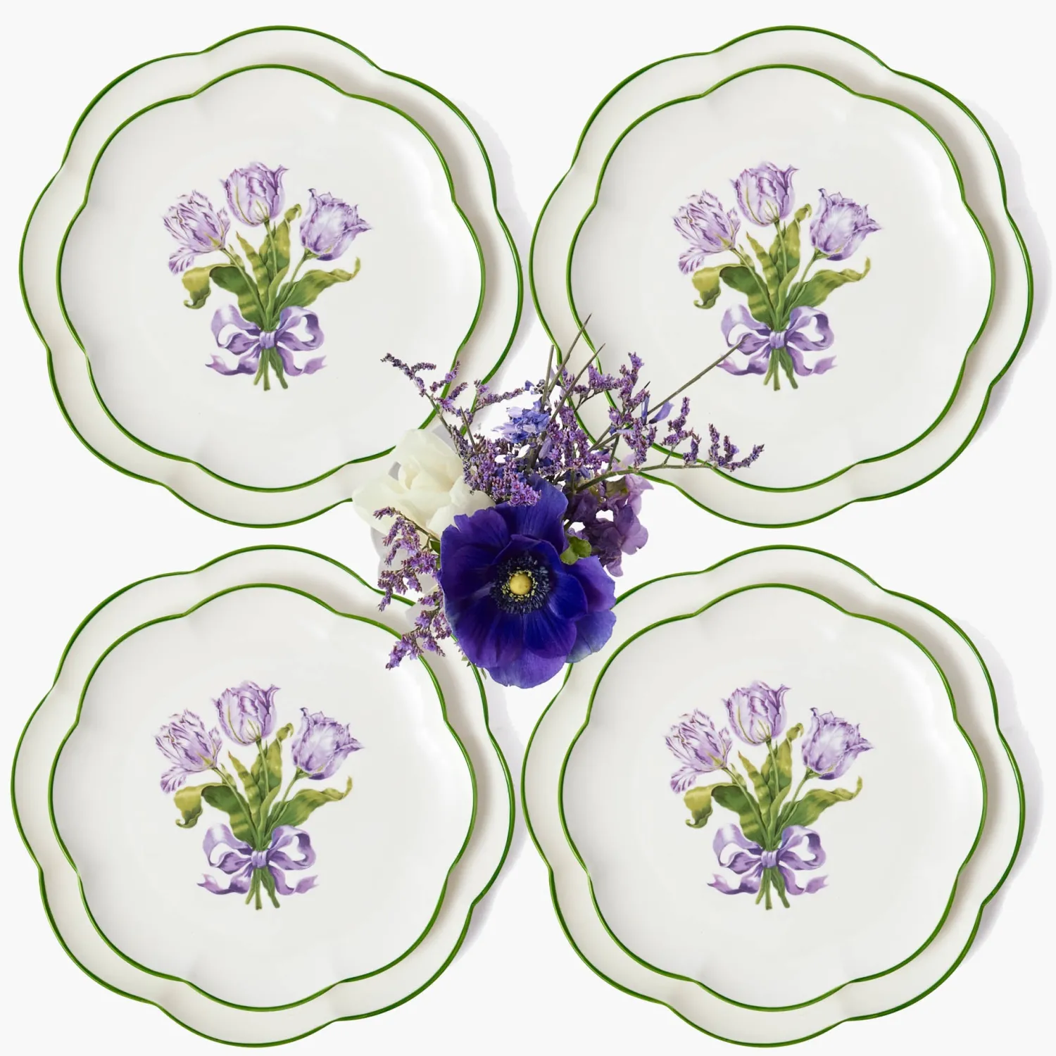 Set a refreshing scene with our Purple Tulip Dinner & Starter Plates (Set of 8). Designed with a charming green scalloped rim and beautiful lilac tulip motif at the centre, this four-person set is perfect for serving your springtime dishes.