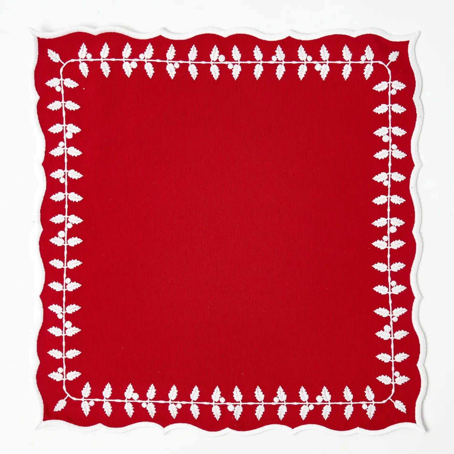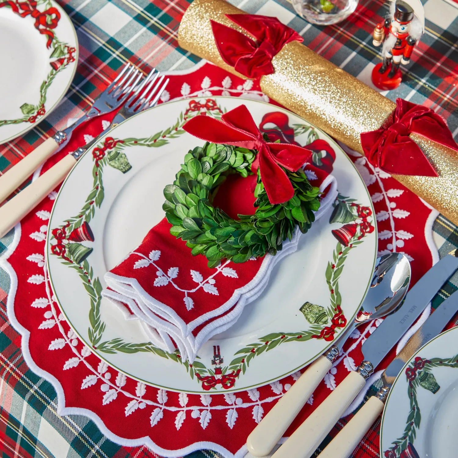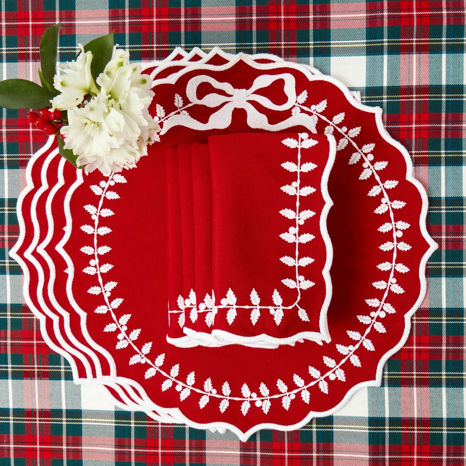 Our Red Bow Laurel Napkins are sure to elevate your festive dining experiences. With their vibrant red base and white embroidered laurel pattern, these pieces are perfect to enhance your seasonal celebrations.