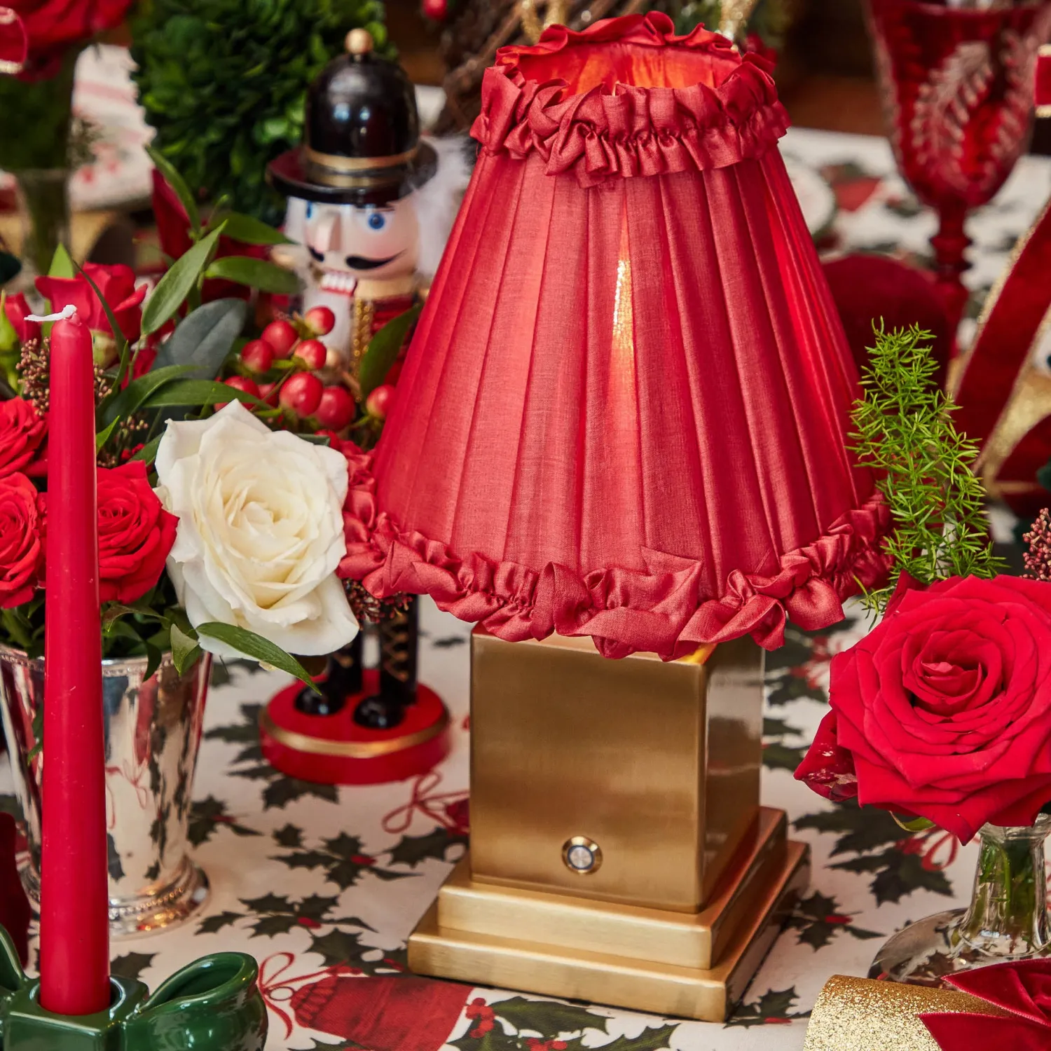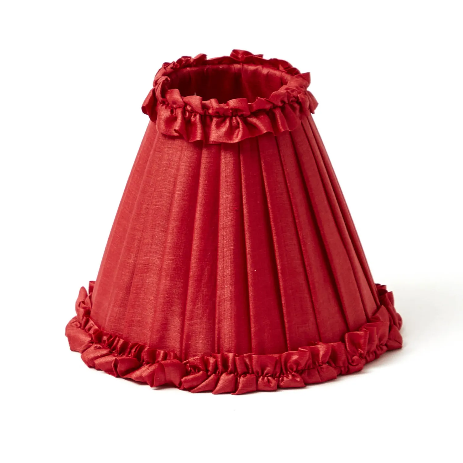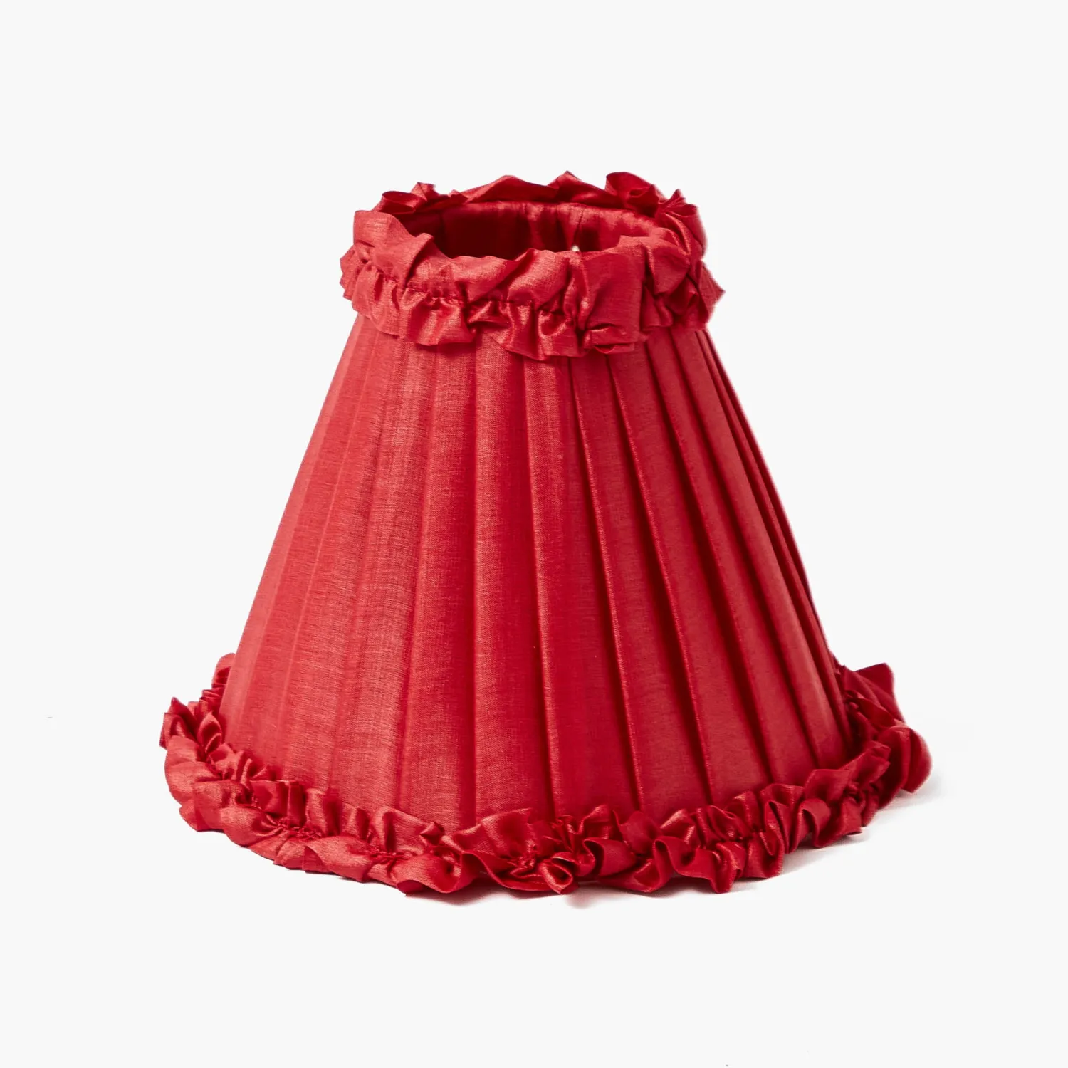 Enhance your holiday table with our luxurious Red Frilled Silk Lampshade. This sumptuous piece features red pleated silk and elegant frilled trims, perfect for coordinating with quintessential Christmas colourways.