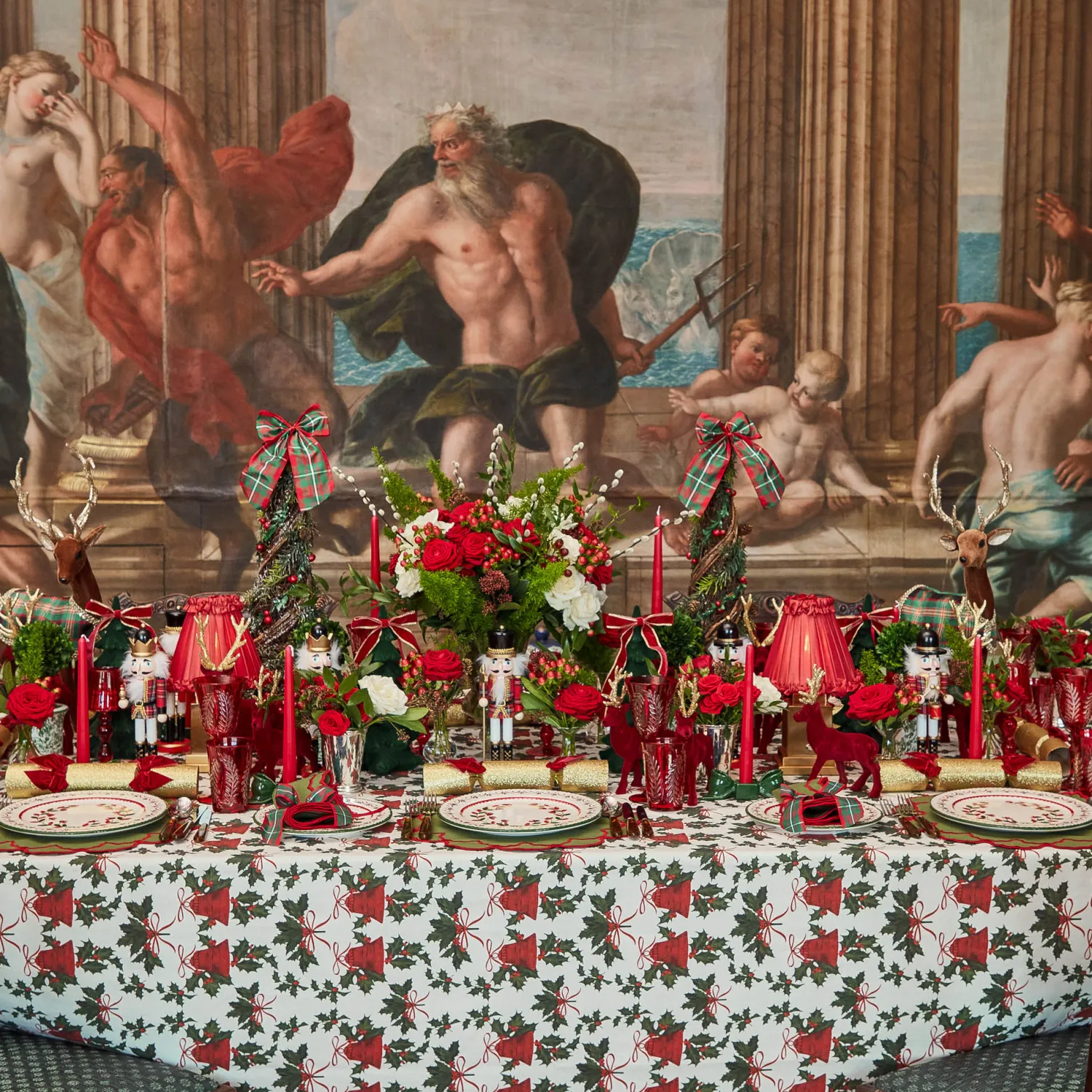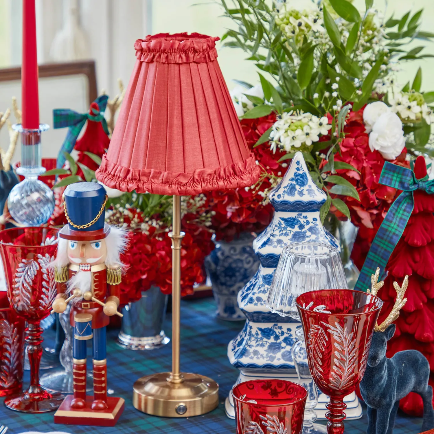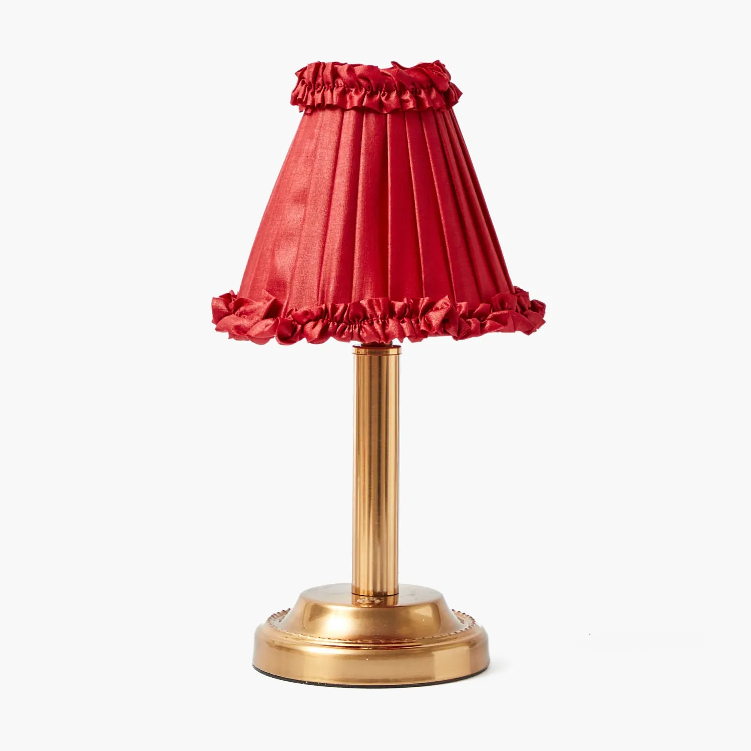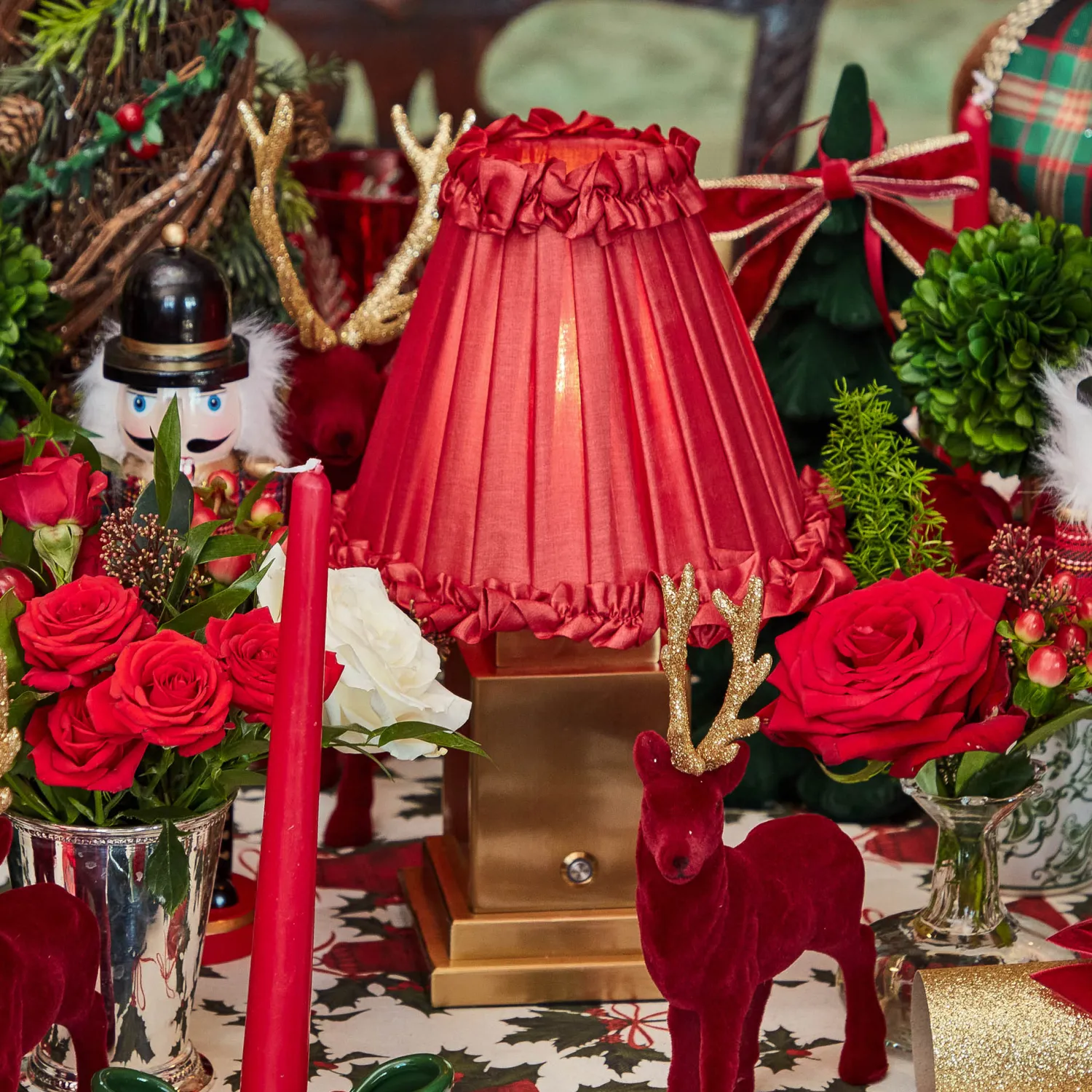 Enhance your holiday table with our luxurious Red Frilled Silk Lampshade. This sumptuous piece features red pleated silk and elegant frilled trims, perfect for coordinating with quintessential Christmas colourways.