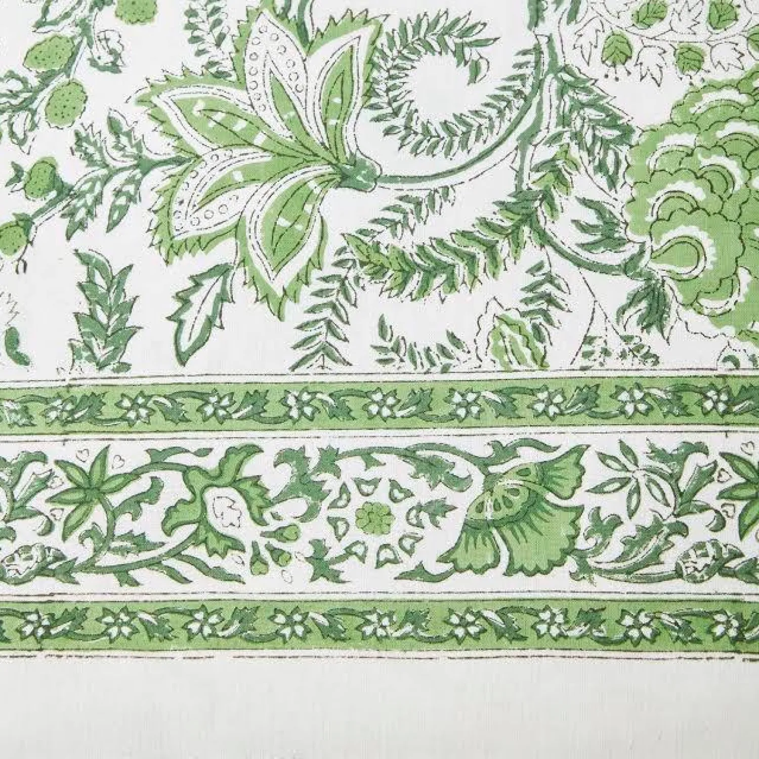 Our attractive and versatile Serena Green Tablecloth is hand block printed and features floral motifs in fresh and green tones.