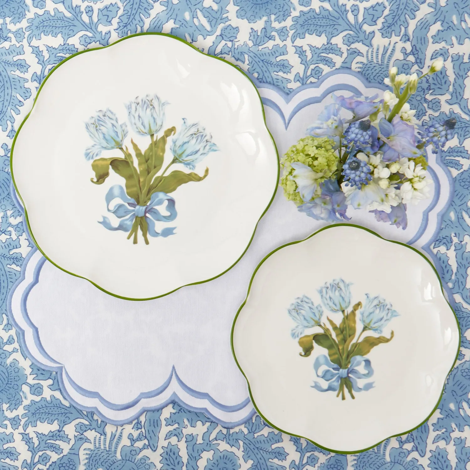 The crisp white linen comes with a double-scalloped embroidered border in soft blue.
