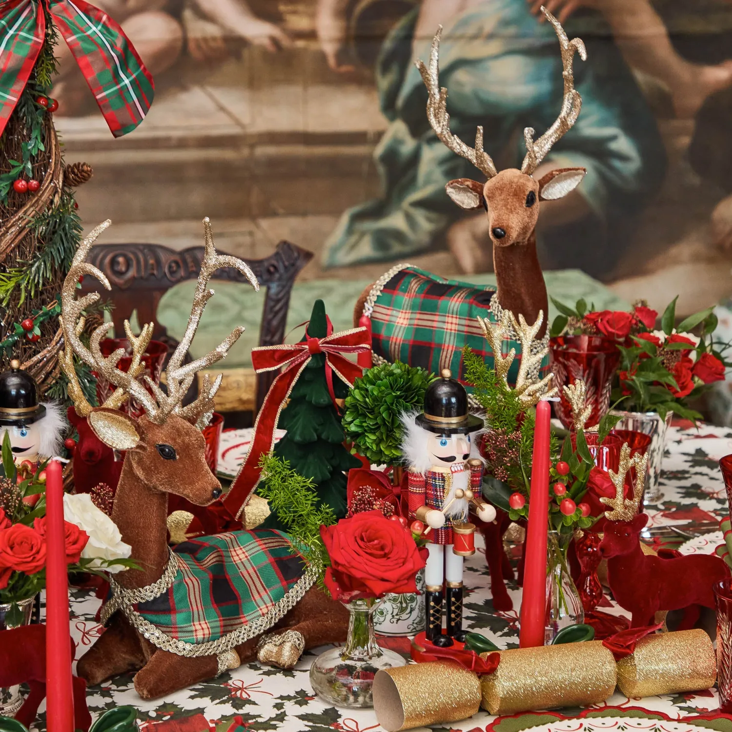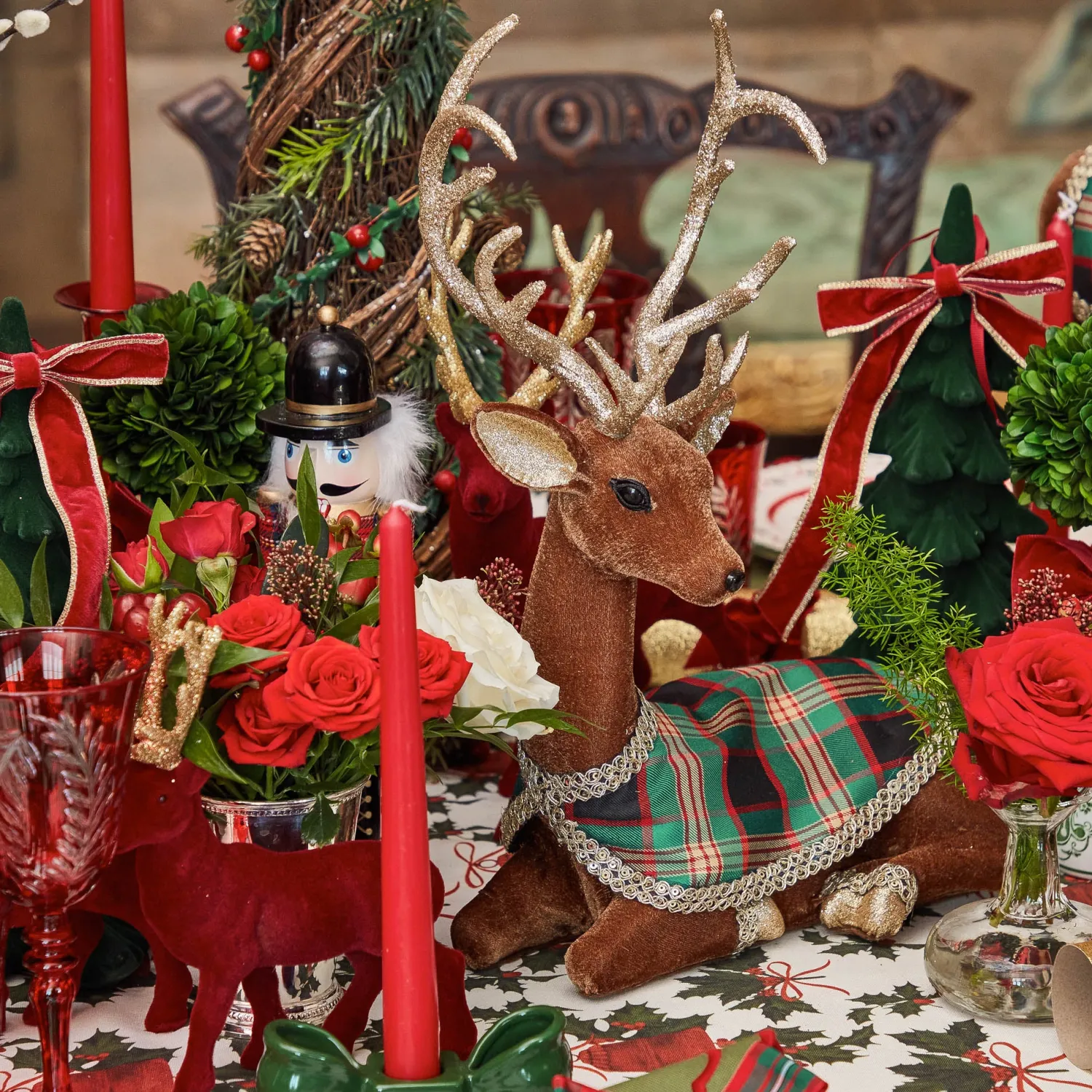 Uplift your holiday table or mantlepiece with our whimsical Sitting Tartan Flocked Deer. Coming in a set of two, these chocolate-flocked deers feature shimmering gold hoovers and antlers which perfectly complement their traditional tartan jackets.