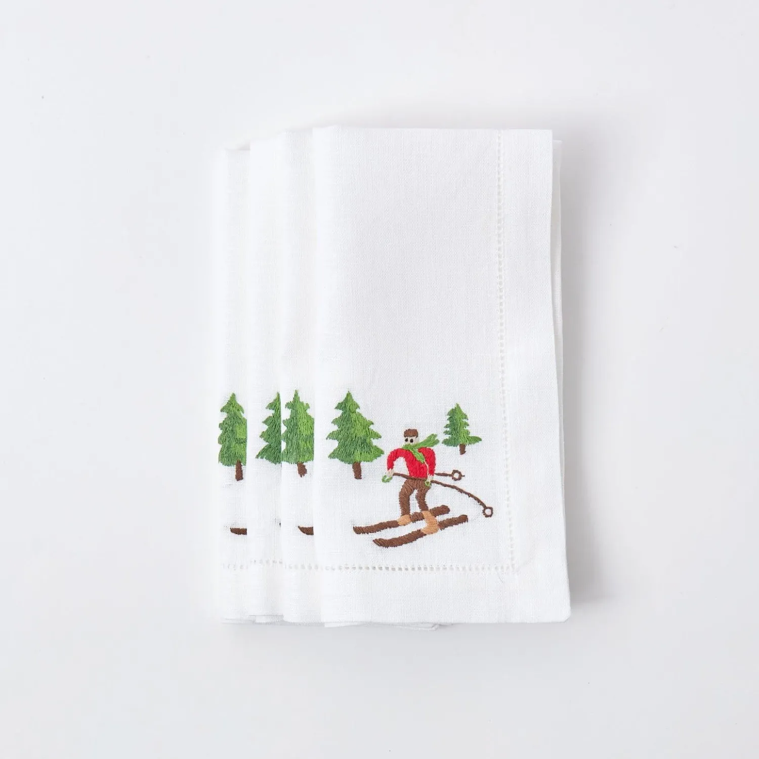 These charming white 100% linen napkins come with an enchanting hand embroidered skier in a festive red and green gliding through the trees.